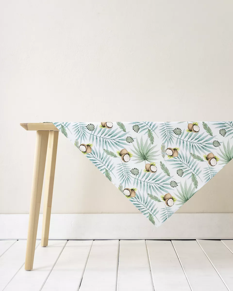 Καρέ από 100% βαμβάκι με ύφανση half panama προσφέρει φυσική απαλότητα και ανθεκτικότητα. το ζωηρό σχέδιο με καρύδες και πλούσια φύλλα δημιουργεί μια δροσερή, χαλαρή ατμόσφαιρα, σαν καλοκαιρινή απόδραση. πρακτικό και εντυπωσιακό, αποτελεί ιδανική επιλογή για να δώσετε τροπικό χαρακτήρα σε κάθε περίσταση.