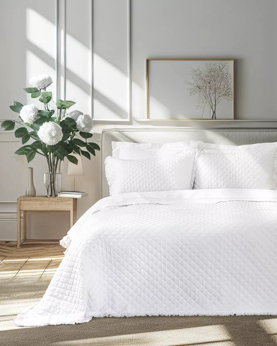 Κουβερλί microfiber με επεξεργασία stonewashed & vintage dyed σε λευκό χρώμα με βολάν. κατασκευασμένο από 100% stonewashed microfiber 100 γρ./μ² με γέμιση polyester 120 γρ./μ², που προσφέρει απαλή αίσθηση και άνεση στη χρήση. ιδανικό σκέπασμα για ανοιξιάτικους και καλοκαιρινούς μήνες.