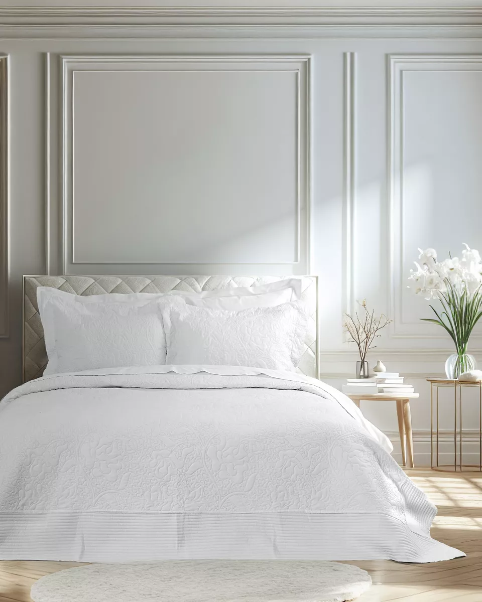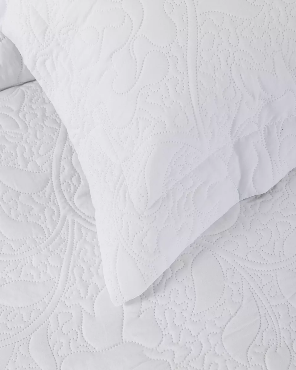 Σετ κουβερλί καπιτονέ σε άσπρο χρώμα με φλοράλ σχέδιο και φάσες στις 3 πλευρές. κατασκευασμένο από 100% stonewashed microfiber 90 γρ./μ² με γέμιση polyester 120 γρ./μ², που προσφέρει απαλή αίσθηση και άνεση στη χρήση. ιδανικό σκέπασμα για ανοιξιάτικους και καλοκαιρινούς μήνες.