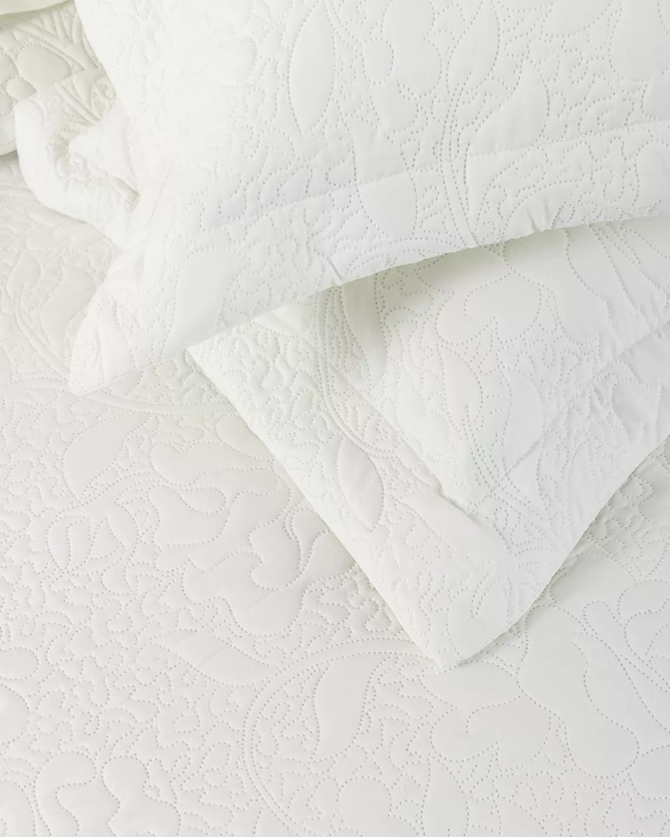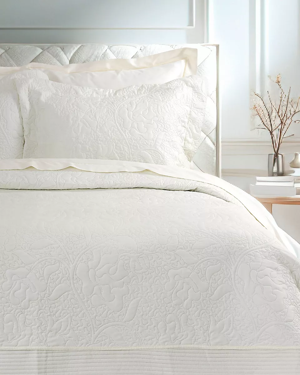 Σετ κουβερλί καπιτονέ σε εκρού χρώμα με φλοράλ σχέδιο και φάσες στις 3 πλευρές. κατασκευασμένο από 100% stonewashed microfiber 90 γρ./μ² με γέμιση polyester 120 γρ./μ², που προσφέρει απαλή αίσθηση και άνεση στη χρήση. ιδανικό σκέπασμα για ανοιξιάτικους και καλοκαιρινούς μήνες.