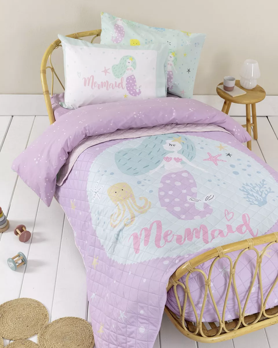 Παιδικό κουβερλί σε μοβ/λιλά χρώμα με εντυπωσιακή γοργόνα. είναι κατασκευασμένο σε τυπωτό ύφασμα 100% microfiber με γέμιση από πολυεστερική βάτα 85 gsm.το απαλό microfiber ύφασμα και η ελαφριά γέμιση προσφέρουν ιδανική θερμοκρασία για άνετο και ξεκούραστο ύπνο κάθε βράδυ.