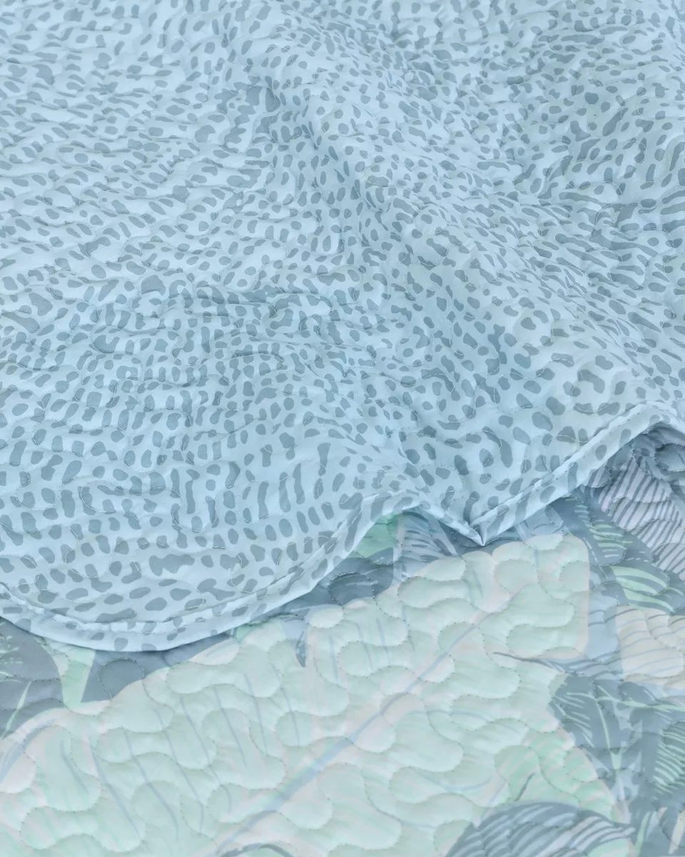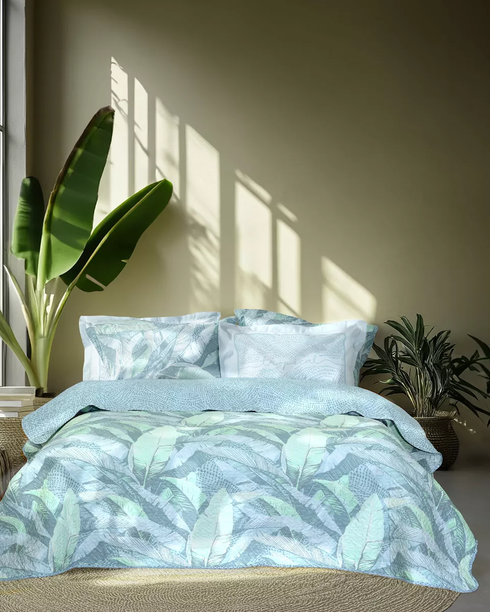 Κουβερλί σε τιρκουάζ - πράσινο χρώμα με μοντέρνο σχέδιο. είναι κατασκευασμένο από 100% βαμβάκι 144 κλωστών με γέμιση από πολυεστερική βάτα 120 gsm, που το καθιστά απαλό, ζεστό και άνετο στη χρήση. ιδανικό για να ανανεώσει το υπνοδωμάτιο με στυλ και άνεση.