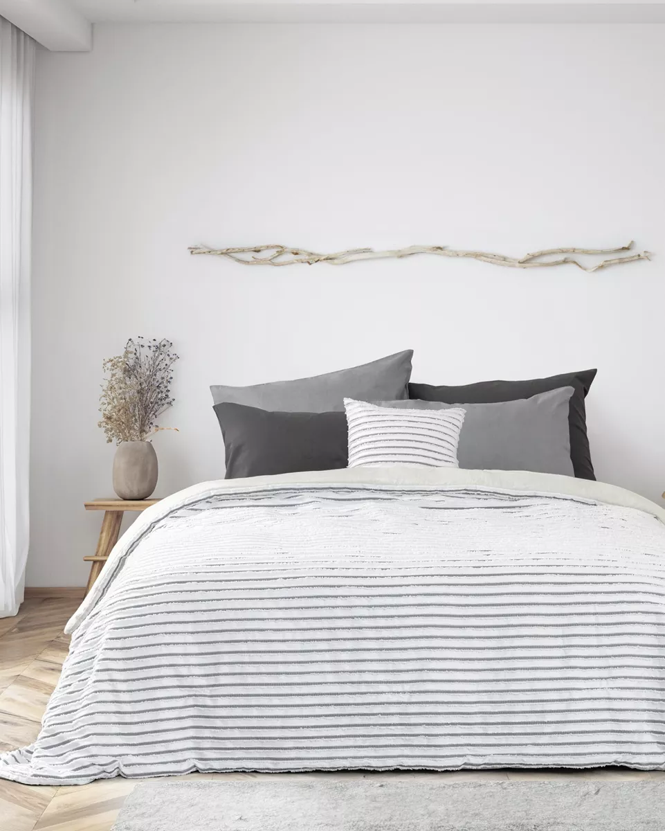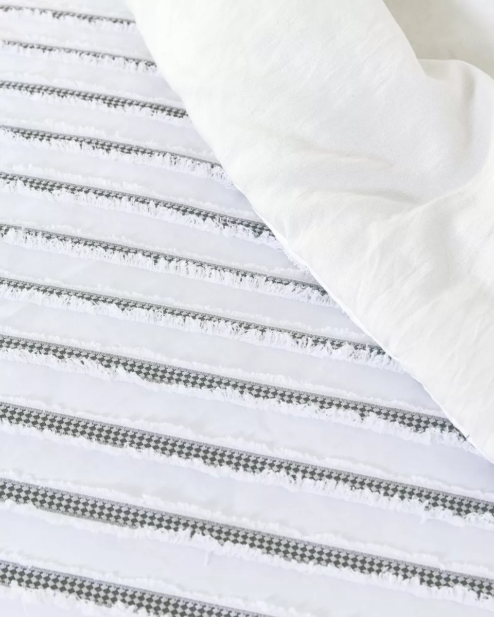 Κουβερλί σε λευκό - γκρι χρώμα με ριγέ υφαντό ζακάρ σχέδιο. η μπροστινή πλευρά είναι από clipped jacquard microfiber 110 γρ./μ², ενώ η πίσω πλευρά από prewashed microfiber 90 γρ./μ². διαθέτει γέμιση από polyester 180 γρ./μ² που προσφέρει απαλή αίσθηση και άνεση στη χρήση. ιδανικό σκέπασμα για ανοιξιάτικους και καλοκαιρινούς μήνες.