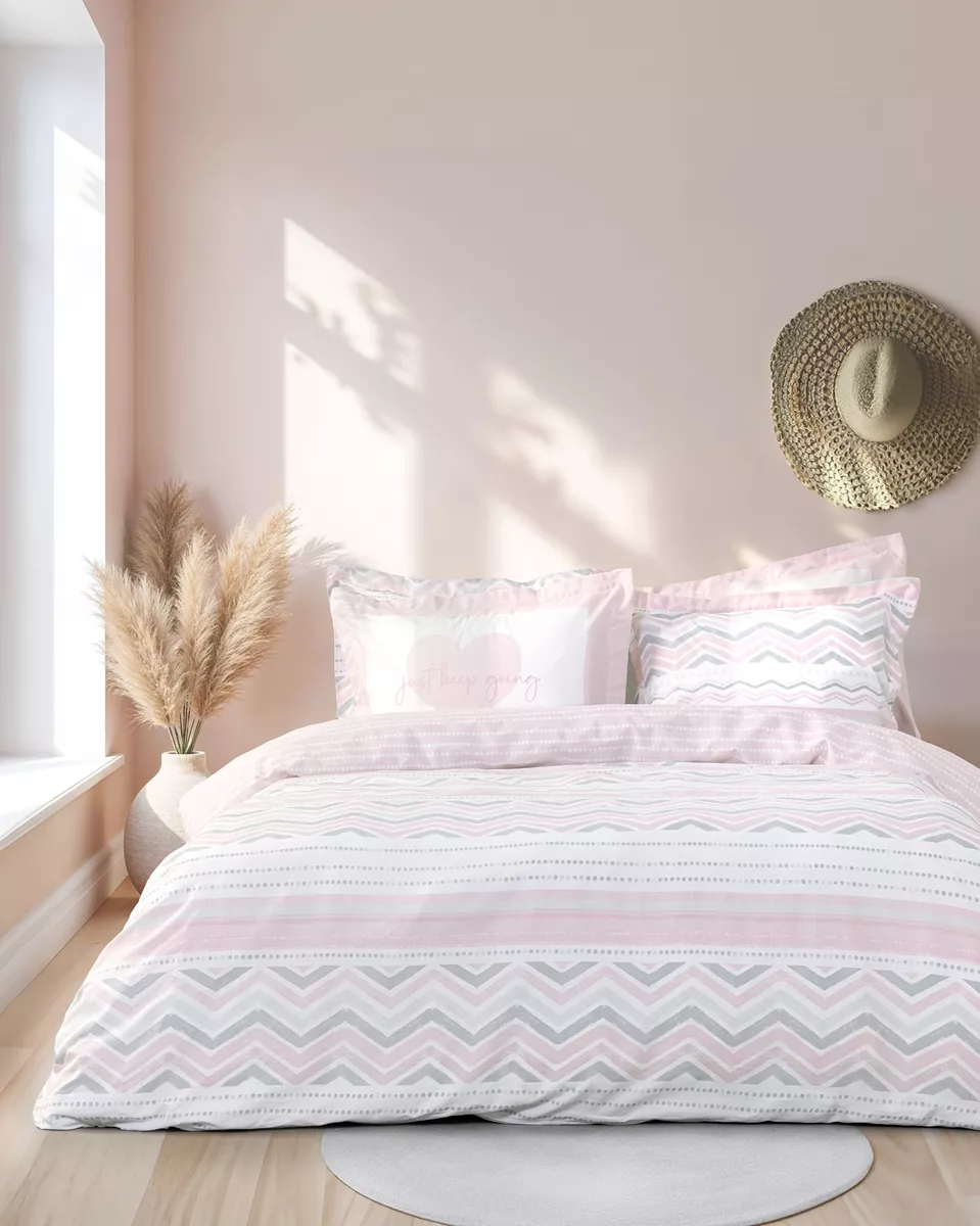 Κουβερλί σε ροζ - γκρι χρώμα με μοντέρνο σχέδιο. είναι κατασκευασμένο από 100% βαμβάκι 144 κλωστών με γέμιση από πολυεστερική βάτα 120 gsm, που το καθιστά απαλό, ζεστό και άνετο στη χρήση. ιδανικό για να ανανεώσει το υπνοδωμάτιο με στυλ και άνεση.