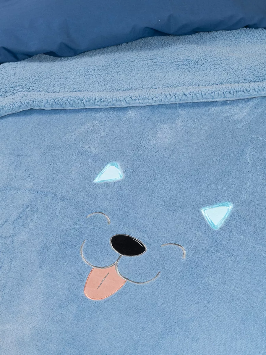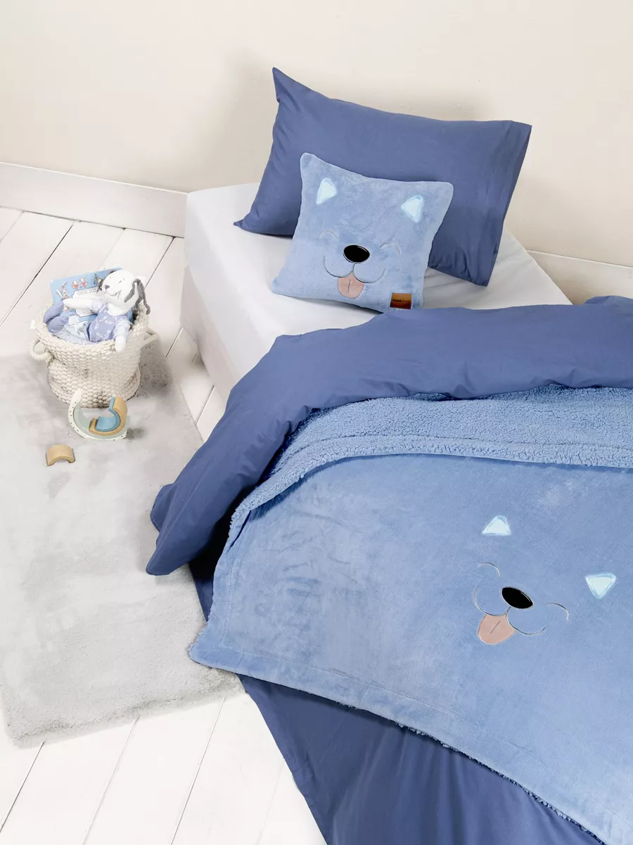 Η παιδική κουβέρτα tony έχει ένα minimal και απίστευτα χαριτωμένο σχεδιασμό. h κουβέρτα έχει ένα ένα φωτεινό μπλε χρώμα και ξεχωρίζει για το αξιολάτρευτο, κεντητό σχέδιο ενός χαμογελαστού σκύλου στην μπροστινή όψη. Έχει στρογγυλεμένα μάγουλα, κλειστά μάτια, μια μικρή ροζ γλώσσα που βγαίνει παιχνιδιάρικα, και γαλάζια αυτιά, δημιουργώντας ένα ζωντανό και φιλικό προσωπάκι. Χαρίστε στο παιδί σας την πιο ζεστή και διασκεδαστική αγκαλιά με την παιδική κουβέρτα "tony", σχεδιασμένη για διπλή απόλαυση και άνεση. Συνδυάστε τη και με το ασορτί μαξιλαράκι, για ένα ακόμα πιο όμορφο και παιχνιδιάρικο αισθητικό αποτέλεσμα!