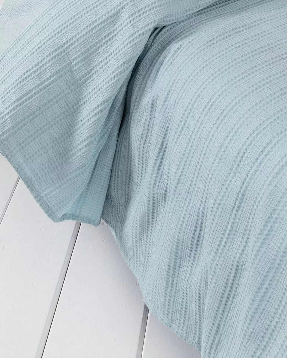 Κουβέρτα πικέ σε απαλό μπλε χρώμα. κατασκευασμένη από 100% βαμβάκι με δίκλωνα νήματα, 200 γρ./μ², με ειδικό φινίρισμα garment wash που προσφέρει πολύ απαλή αίσθηση και δεν επηρεάζεται στο πλύσιμο. ιδανικό σκέπασμα για ανοιξιάτικους και καλοκαιρινούς μήνες.