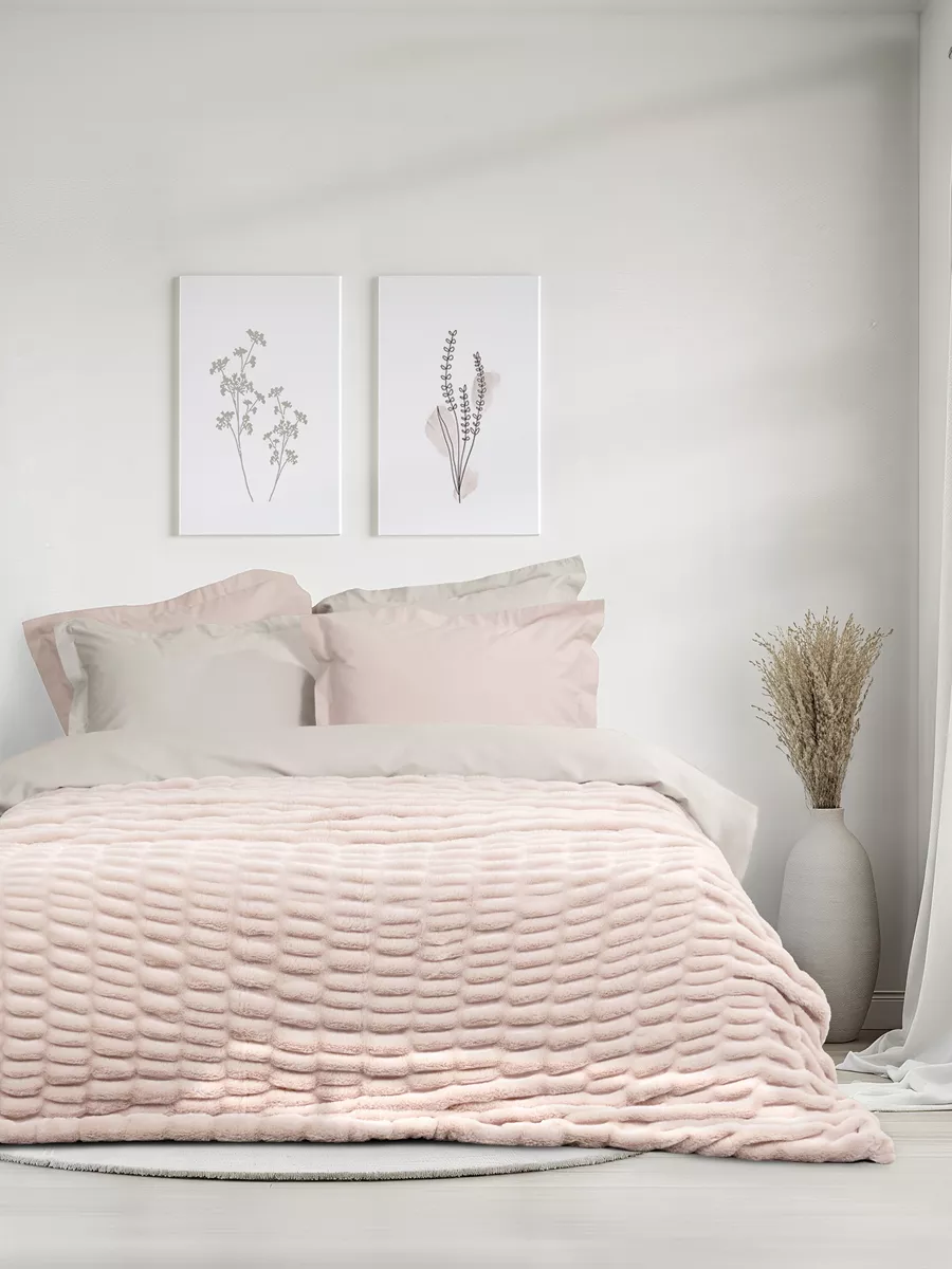 Η κουβέρτα διπλής όψης mossy light pink είναι σχεδιασμένη για να προσφέρει απαράμιλλη άνεση και στυλ, με κάθε λεπτομέρεια να αποπνέει φινέτσα. Η μπροστινή πλευρά, από jacquard rabbit fur, διαθέτει ένα εντυπωσιακό, ανάγλυφο γεωμετρικό μοτίβο που είναι ταυτόχρονα χνουδωτό και απαλό, σαν αληθινή γούνα. Η πίσω πλευρά, από mink fleece, είναι εξαιρετικά απαλή και ζεστή. Το ανάγλυφο μοτίβο σε συνδυασμό με το απαλό ροζ χρώμα προσθέτει μια νότα κομψότητας και ζεστασιάς, κάνοντας την κουβέρτα mossy ιδανική για να διακοσμήσετε το κρεβάτι ή τον καναπέ σας.