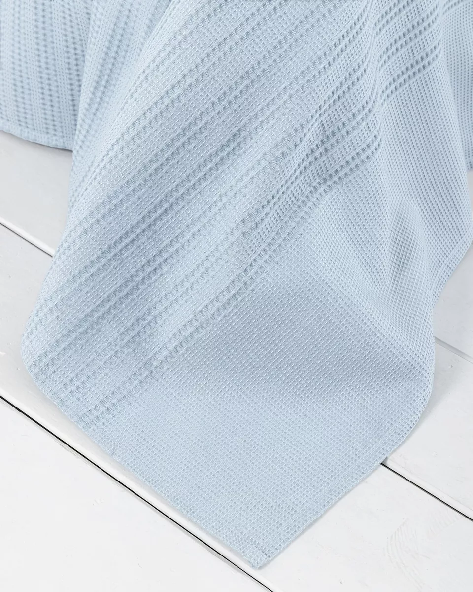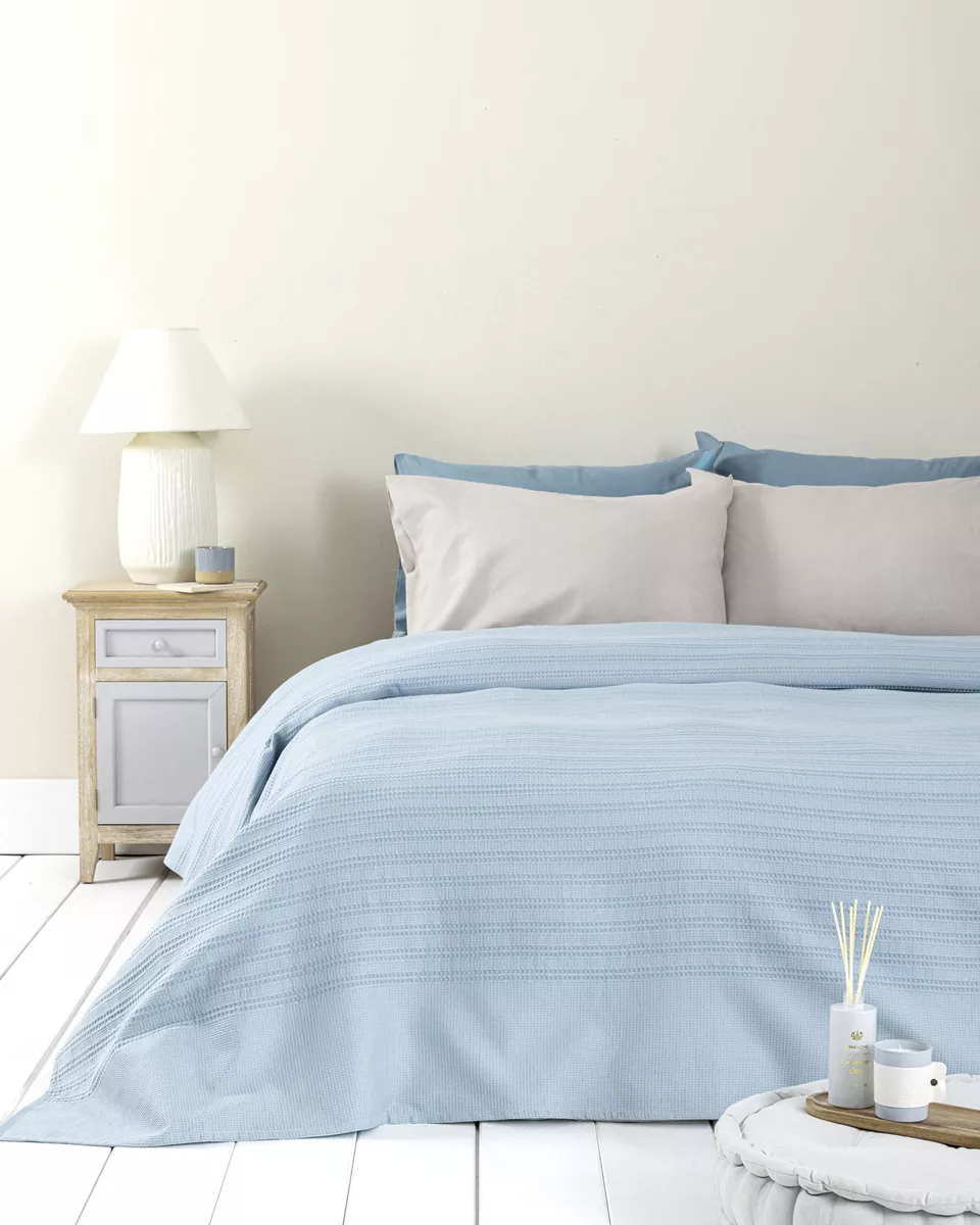 Κουβέρτα πικέ σε μπλε χρώμα. κατασκευασμένη από 100% βαμβάκι με δίκλωνα νήματα, 200 γρ./μ², με ειδικό φινίρισμα garment wash που προσφέρει πολύ απαλή αίσθηση και δεν επηρεάζεται στο πλύσιμο. ιδανικό σκέπασμα για ανοιξιάτικους και καλοκαιρινούς μήνες.
