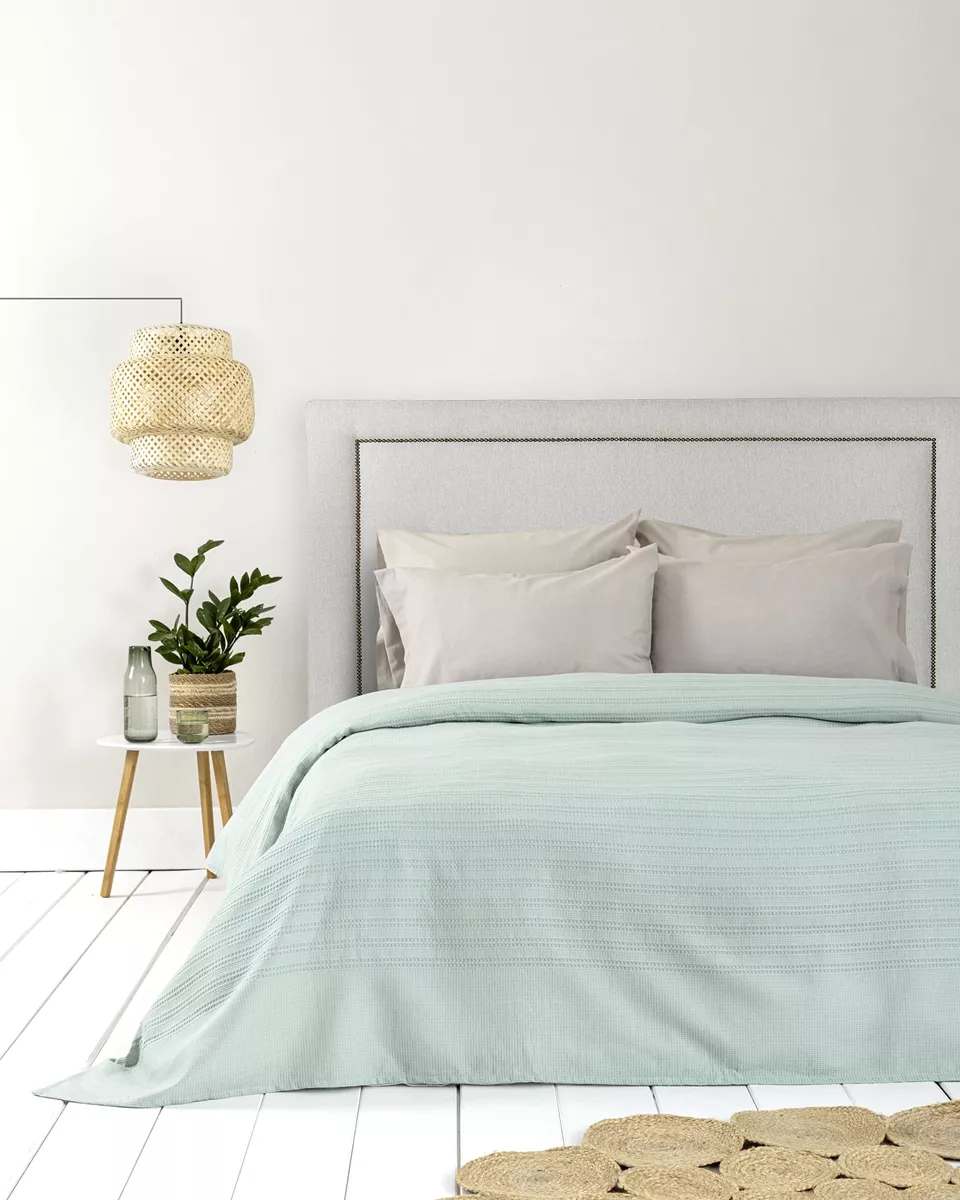 Κουβέρτα πικέ σε χρώμα μέντα. κατασκευασμένη από 100% βαμβάκι με δίκλωνα νήματα, 200 γρ./μ², με ειδικό φινίρισμα garment wash που προσφέρει πολύ απαλή αίσθηση και δεν επηρεάζεται στο πλύσιμο. ιδανικό σκέπασμα για ανοιξιάτικους και καλοκαιρινούς μήνες.