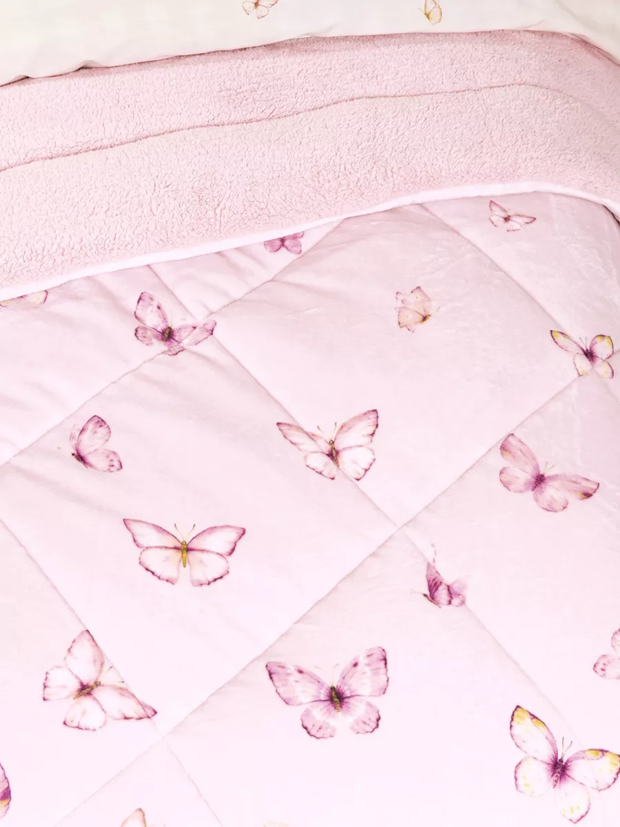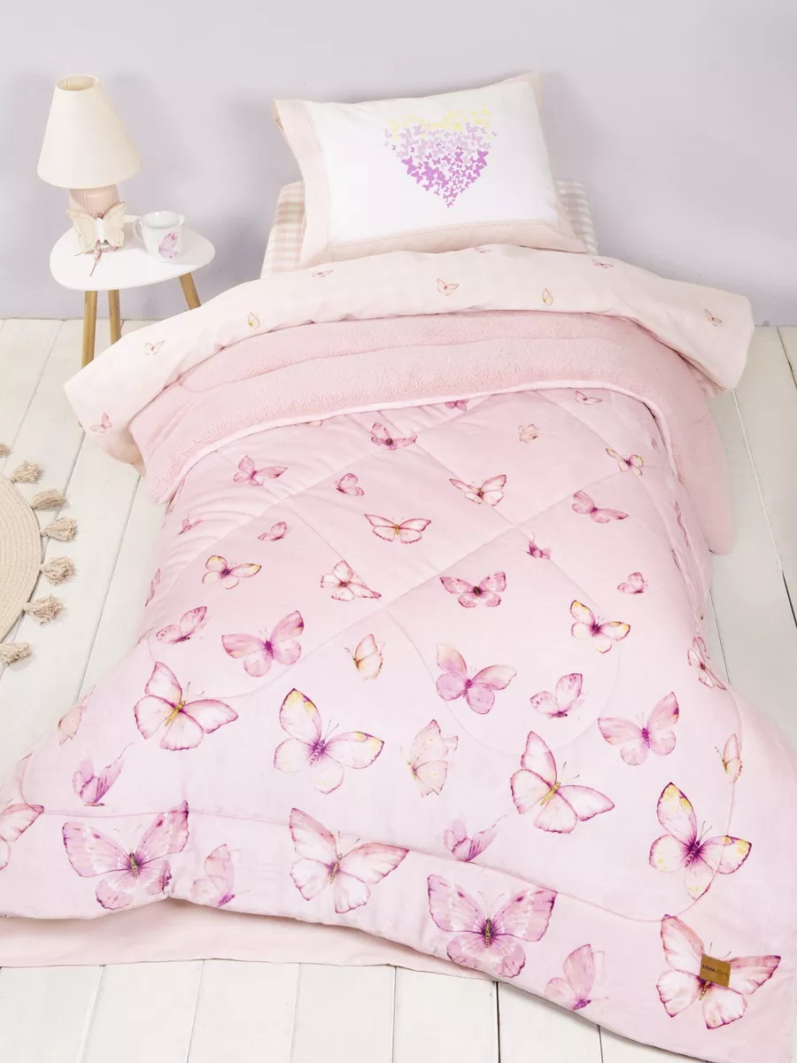 Το παιδικό κουβερτοπάπλωμα bettina, δίνει μια μαγική ατμόσφαιρα στο παιδικό δωμάτιο. Το σχέδιό του είναι εμπνευσμένο από την αέρινη ομορφιά της φύσης. Έχει διάσπαρτες πεταλούδες με εφέ ακουαρέλας, που φαίνονται σαν να κινούνται ανοδικά. Σε γλυκές αποχρώσεις του ροζ και του λιλά, αυτό το κουβερτοπάπλωμα είναι ιδανικό για κάθε μικρή πριγκίπισσα που αγαπά τη φαντασία και τη ζεστασιά. Φτιαγμένο από εξαιρετικά απαλά υλικά, έχει υφή του θυμίζει μια γλυκιά αγκαλιά. Μετατρέψτε το παιδικό υπνοδωμάτιο σε έναν ήρεμο και γλυκό παράδεισο με πεταλούδες. Το κουβερτοπάπλωμα bettina, είναι η ιδανική επιλογή για ζεστασιά, στυλ και άνεση. Συνδυάστε το με το ασσορτί σετ σεντονιών bettina, για να συπληρώστε την μαγεία.....