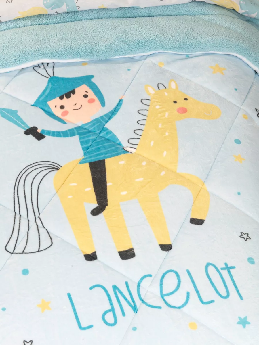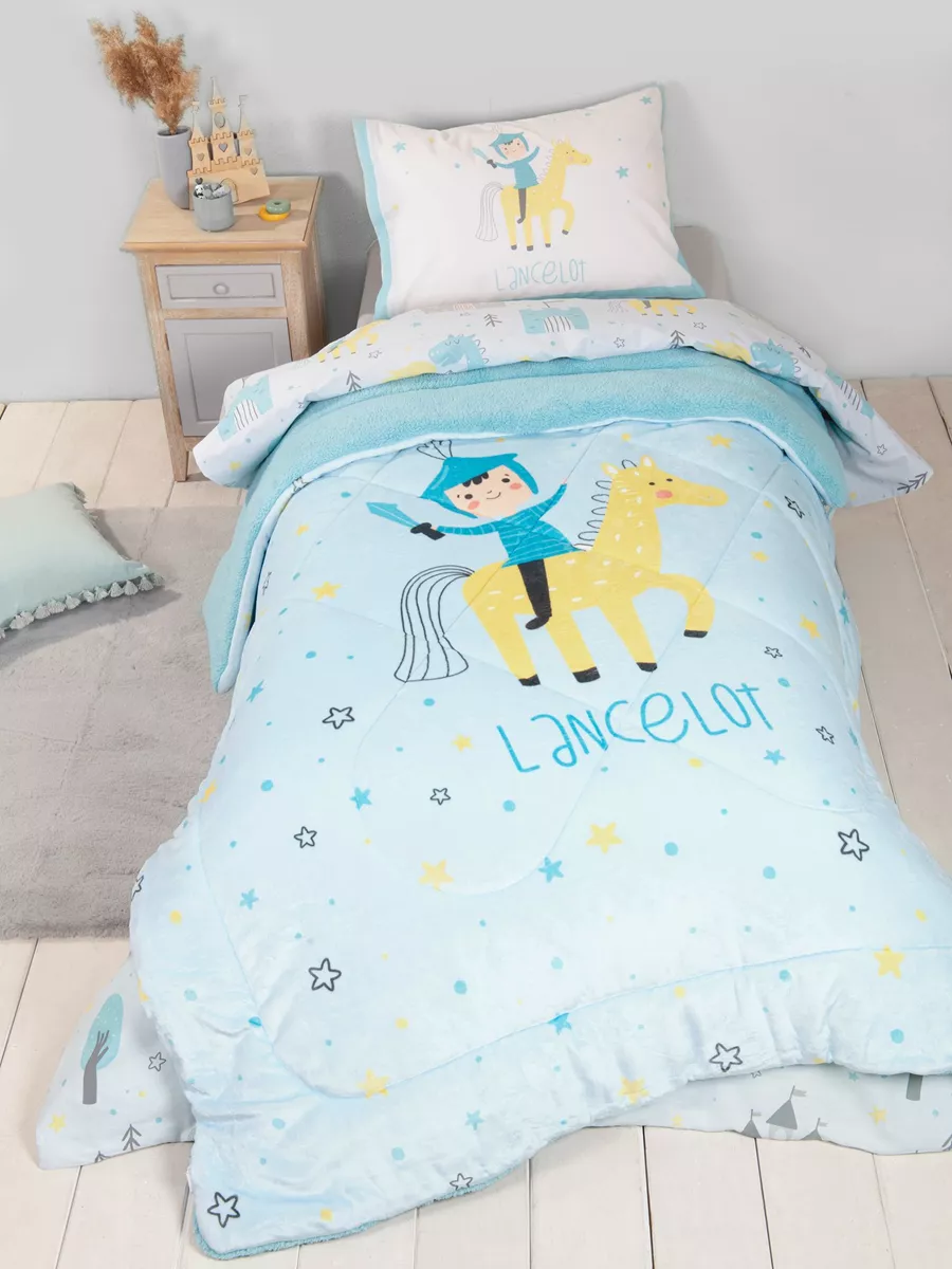 Το παιδικό κουβερτοπάπλωμα lancelot είναι ο απόλυτος σύμμαχος για να χαρίσετε στο παιδί σας έναν ονειρικό ύπνο. Έχει πάνελ σχέδιο, εμπνευσμένο από τον μαγικό κόσμο των ιπποτών, δοσμένο με απλές γραμμές, σαν να είναι σχεδιασμένο από μικρό καλλιτέχνη! Ένας γενναίος ιππότης με το άλογό του είναι το κεντρικό θέμα, ενώ διακοσμητικά αστεράκια γεμίζουν την υπόλοιπη επιφάνεια του κουβερτοπαπλώματος. Η χρωματική του παλέτα κινείται σε απαλούς τόνους του γαλάζιου, τιρκουάζ και του φωτεινού κίτρινου. Φτιαγμένο από εξαιρετικά απαλά υλικά, έχει υφή του θυμίζει αγκαλιά. Δημιουργήστε ένα παραμυθένιο σκηνικό στο παιδικό δωμάτιο με το κουβερτοπάπλωμα lancelot, που συνδυάζει ζεστασιά, άνεση και μοναδικό στυλ. Το τέλειο δώρο για κάθε μικρό ιππότη!