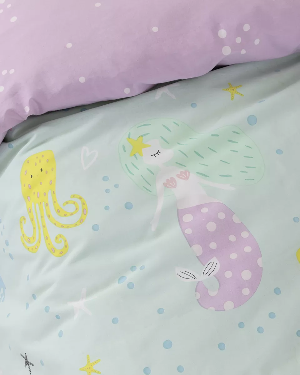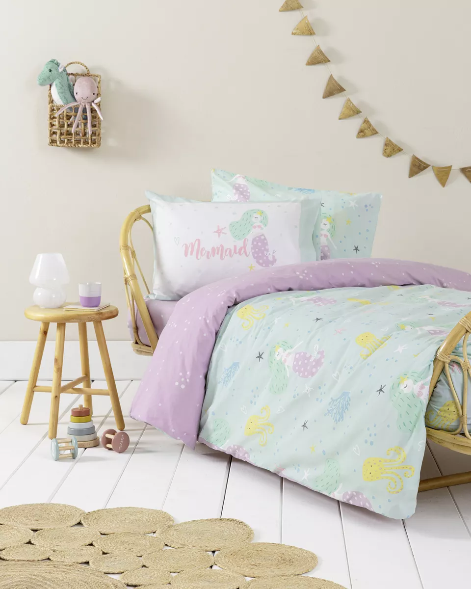 Σετ παιδικά σεντόνια από 100% βαμβάκι 144 κλωστών, με απαλή υφή και ανθεκτικότητα για καθημερινή χρήση. σε απαλές αποχρώσεις μέντα/μοβ με καλοκαιρινό σχέδιο, δημιουργούν μια χαρούμενη ατμόσφαιρα στο παιδικό δωμάτιο. η φυσική τους σύνθεση είναι υποαλλεργική και φιλική προς το δέρμα, προσφέροντας άνεση και ξεκούραστο ύπνο.