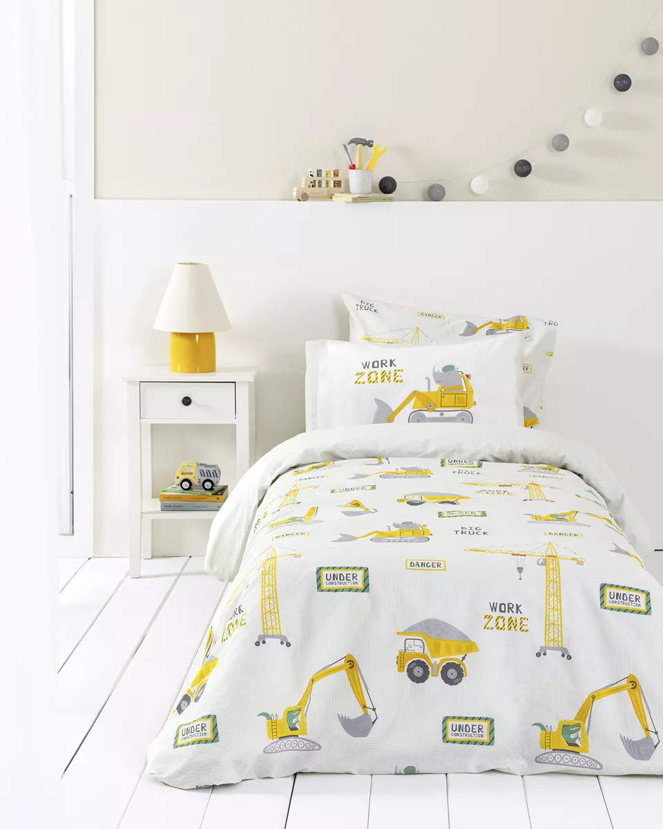 Σετ παιδικά σεντόνια από 100% βαμβάκι 144 κλωστών, με απαλή υφή και ανθεκτικότητα για καθημερινή χρήση. σε απαλό γκρι χρώμα με κίτρινες διασκεδαστικές μαστορικές πινελιές, ταιριάζουν ιδανικά σε κάθε παιδικό δωμάτιο. η φυσική τους σύνθεση είναι υποαλλεργική και φιλική προς το δέρμα, προσφέροντας άνεση και ευχάριστο ύπνο.