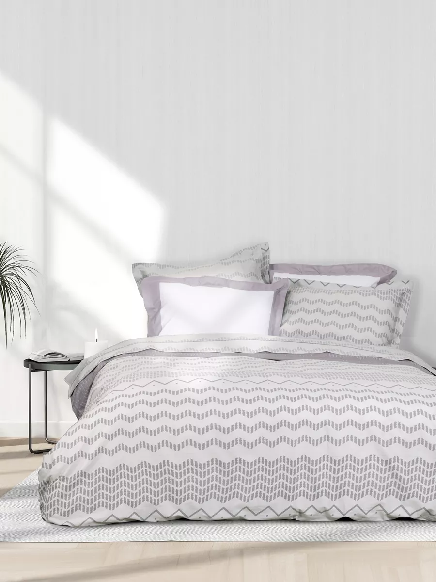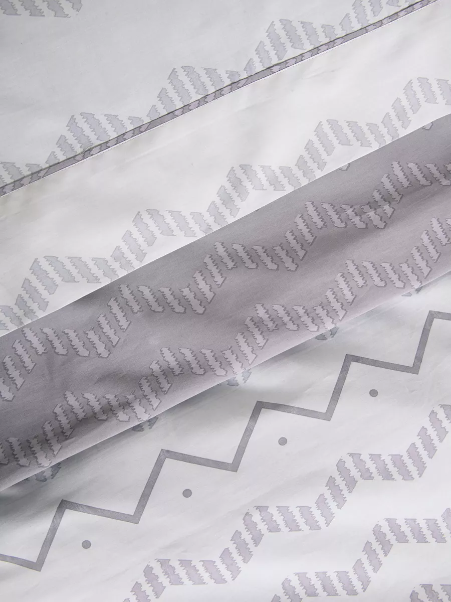 Τα βαμβακοσατέν σετ σεντόνια jeymour διαθέτουν σχέδιο με ένα κομψό γεωμετρικό ζιγκ-ζαγκ μοτίβο σε μια ήρεμη παλέτα από αποχρώσεις του γκρι και του λευκού. Το μοτίβο δημιουργείται από διακεκομμένες γραμμές, προσδίδοντας μια χειροποίητη, ανάγλυφη όψη που ξεχωρίζει. Αυτό το αφηρημένο σχέδιο δίνει μια μοντέρνα και δυναμική πινελιά στον χώρο σας. Το κατωσέντονο έχει διακριτική παρουσία με minimal γεωμετρικό μοτίβο, που αφήνει τον πρωταγωνιστικό ρόλο τόσο στο πανωσέντονο όσο και στις μαξιλαροθήκες του σετ. Οι λιτές πάνελ μαξιλαροθήκες που περιλαμβάνονται, έχουν ραφή oxford 4 πλευρών που τονίζουν την πολυτελή αισθητική του σχεδίου. Αναβαθμίστε την εμπειρία του ύπνου σας με το σετ σεντονιών jeymour, που συνδυάζει την πολυτέλεια του σατέν με ένα μοντέρνο, καλλιτεχνικό σχέδιο.