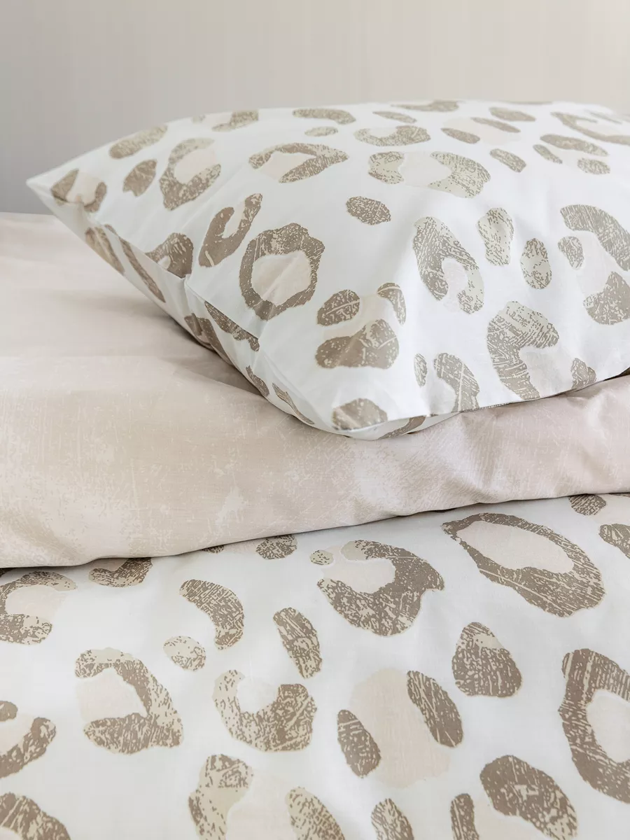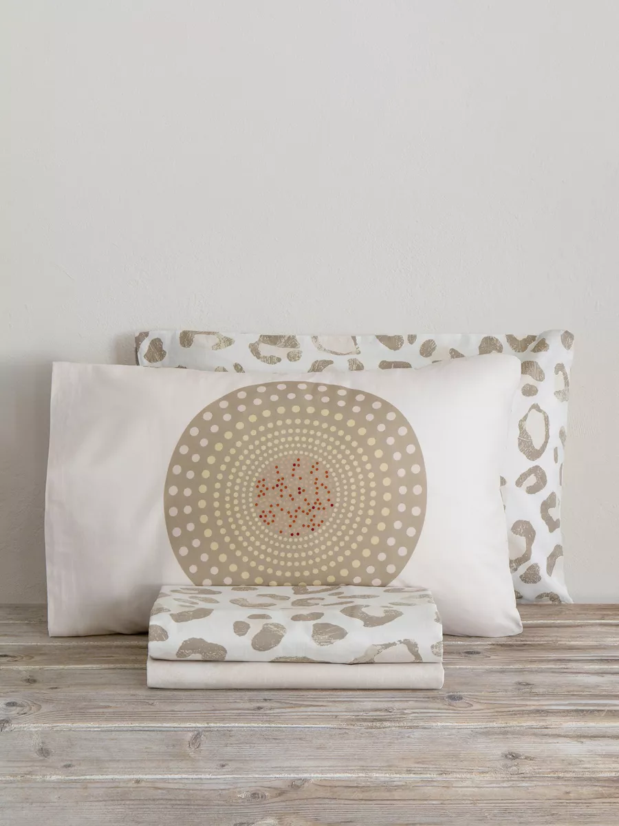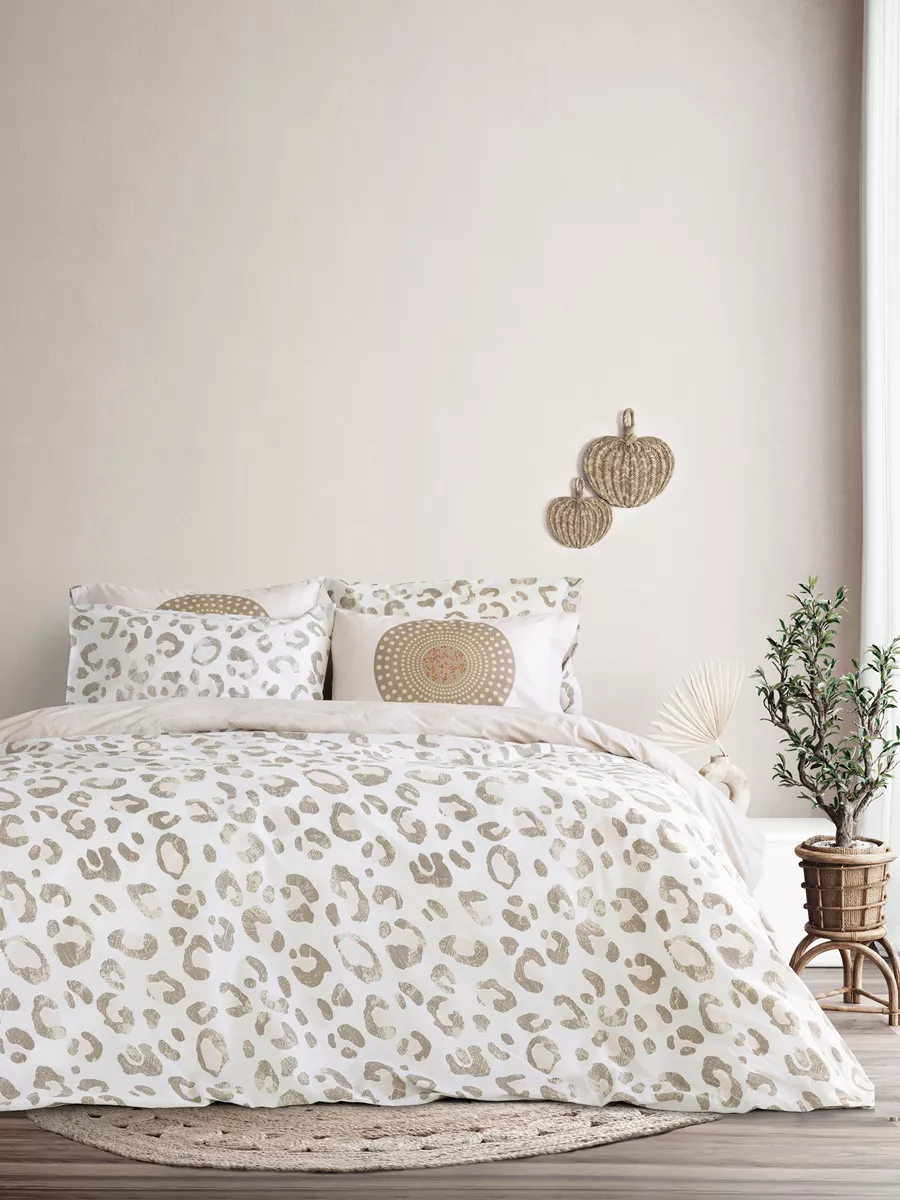 τα βαμβακερά σεντόνια makena έχουν ένα animal print σχέδιο σε αποχρώσεις του ζεστού μπεζ συνδυασμένες έξυπνα με το nude. οι μαξιλαροθήκες του σετ έχουν πάνελ ethnic μοτίβο στην μία τους όψη, ενώ στην δεύτερη έχουν το επαναλαμβανόμενο σχέδιο του πανωσέντωνου. τόσο τα χρώματα όσο και τα μοτίβα του σχεδίου είναι διαχρονικά και αγαπημένα και αποτελούν μια μόνιμη θα έλεγε κανείς τάση στην διακόσμηση του σπιτιού. συνδιάζονται τέλεια με έπιπλα από φυσικά υλικά όπως το ξύλο αλλά και φυσικά ψάθινα στοιχεία, όπως χαλιά ή διακοσμητικά που μεταφέρουν σε μια άκρως καλοκαιρινή διάθεση.