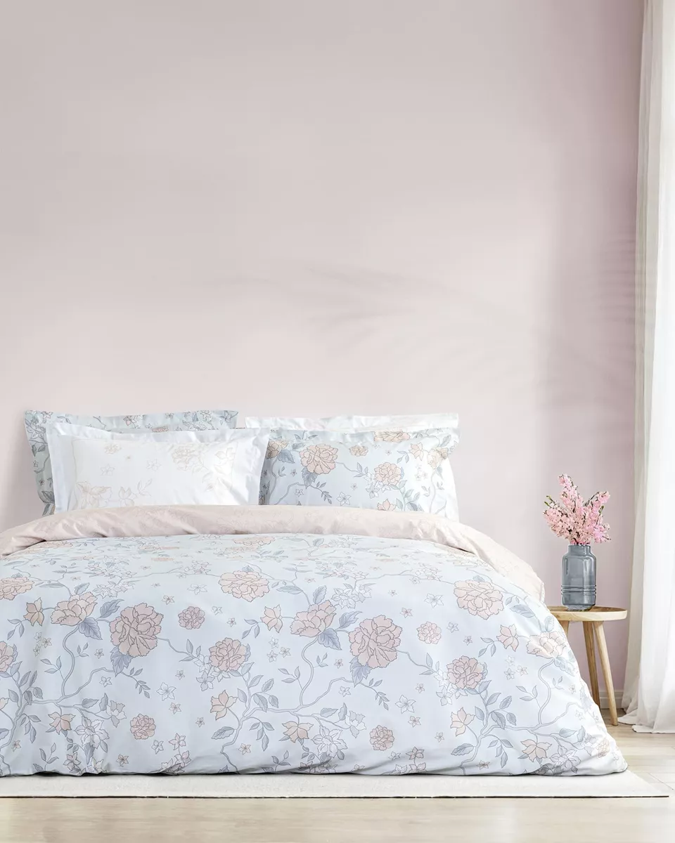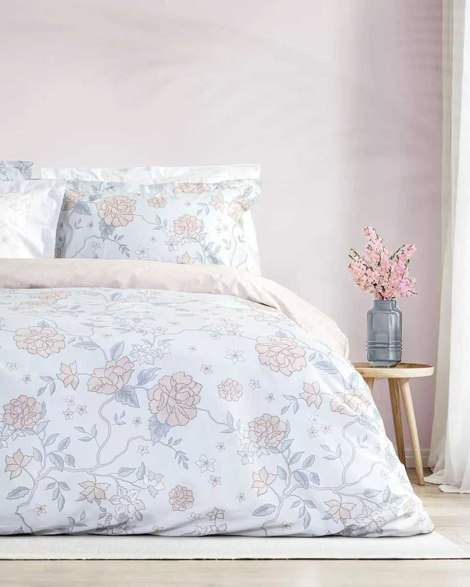 Σετ σεντόνια σε σιέλ - ροζ χρώμα με φλοράλ σχέδιο. είναι κατασκευασμένα από 100% βαμβάκι 144 κλωστών, που τα καθιστά απαλά, ανθεκτικά και άνετα στη χρήση. οι μαξιλαροθήκες είναι oxford 4 πλευρών δύο όψεων – η μία με το σχέδιο του πανωσέντονου και η άλλη σε στις ίδιες αποχρώσεις με πάνελ διακριτικό μοτίβο. ιδανικό για να ανανεώσει το υπνοδωμάτιο με στυλ και άνεση.