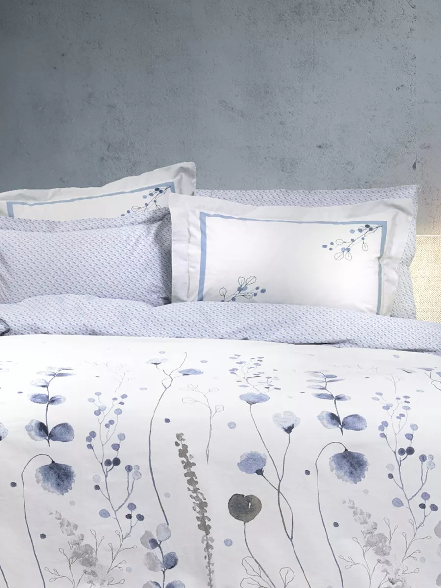 Οι βαμβακερές μαξιλαροθήκες ameya έχουν ένα διακριτικό πάνελ τυπωτό μοτίβο που απεικονίζει κλαδιά με φυλλαράκια και είναι τοποθετημένο στις δύο αντίθετες γωνίες της μαξιλαροθήκης, δημιουργώντας ένα συμμετρικό και καλλιτεχνικό αποτέλεσμα. Το λιτό αυτό σχέδιο πλαισιώνεται με διακριτική μονόχρωμη κορνίζα. Η πίσω όψη τους έχει διακριτικό γεωμετρικό all over μοτίβο σε αποχρώσεις του μπλέ. Η συμμετρικότητα και καθαρή γεωμετρία των μαξιλαροθηκών τονίζεται από την κατασκευή τους, καθώς είναι oxford 4 πλευρών. Οι μαξιλαροθήκες ameya προσφέρουν μια αίσθηση φρεσκάδας και φυσικής ομορφιάς, με ένα σχέδιο που συνδυάζει την απλότητα με την κομψότητα. Είναι η ιδανική επιλογή για να προσθέσετε μια διακριτική, floral πινελιά στον χώρο σας.