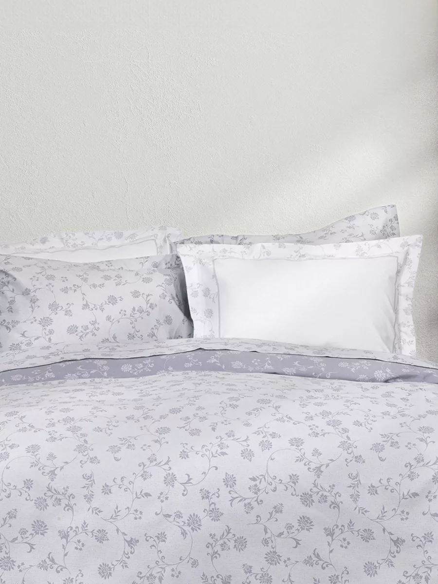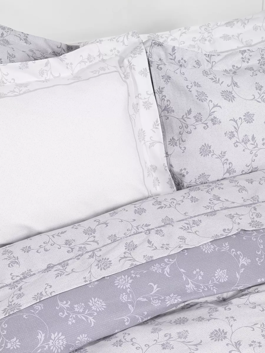 Οι βαμβακερές μαξιλαροθήκες sirena έχουν λιτό πάνελ μοτίβο, όπου ένα ρομαντικό floral μοτίβο με vintage αισθητική που θυμίζει περίτεχνα κεντήματα, αναπτύσεται στην περιμετρική φάσα, ενώ το κέντρο της μαξιλαροθήκης παραμένει λευκό. Η δεύτερη όψη της έχει all over μοτίβο, με λεπτεπίλεπτα λουλούδια σε αποχρώσεις του γκρι και του λιλά να απλώνονται σε ένα φωτεινό φόντο. Οι μαξιλαροθήκες έχουν τελείωμα oxford με ένα φαρδύ, διακοσμητικό περίγραμμα, που τους δίνει μια πιο πολυτελή και "γεμάτη" όψη. Η χρωματική τους παλέτα και η φίνα κατασκευή τους, τονίζει την διαχρονικότητα και πολυτέλειά τους.