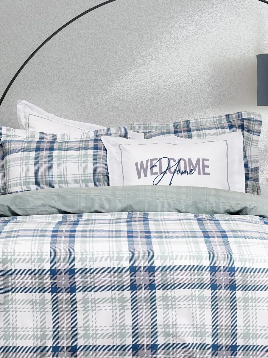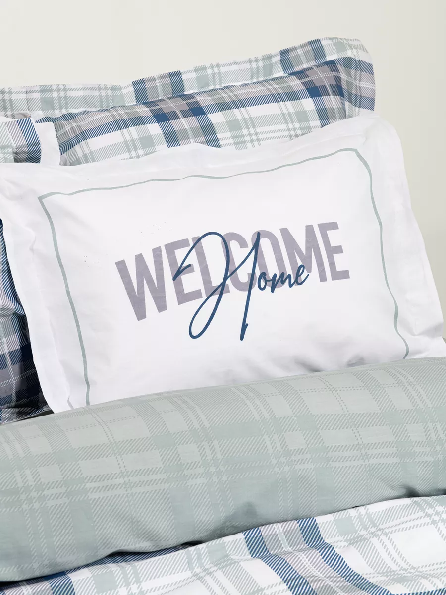 Οι βαμβακερές μαξιλαροθήκες welcome είναι σχεδιασμένες για να προσφέρουν μια ζεστή και φιλόξενη πινελιά στον χώρο σας. h πάνελ όψη τους έχει κεντρικό μοτίβο με τις λέξεις welcome home να περιβάλλονται από λιτή περιμετρική μπορντούρα, ενώ η δεύτερη όψη τους έχει ένα διαχρονικό καρό μοτίβο. Οι μαξιλαροθήκες έχουν ραφή τύπου oxford 4 πλευρών, δηλαδή μια φαρδιά, περιμετρική φάσα που προσδίδει έναν κλασικό και εκλεπτυσμένο χαρακτήρα στη μαξιλαροθήκη. Ο λιτός, αλλά γεμάτος νόημα, σχεδιασμός της την καθιστά ιδανική για να δώσετε μια αίσθηση οικειότητας στο κρεβάτι σας.
