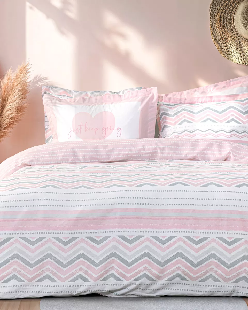 Σετ μαξιλαροθήκες σε ροζ - γκρι χρώμα με μοντέρνο σχέδιο. είναι κατασκευασμένες από 100% βαμβάκι 144 κλωστών, που τις καθιστά απαλές, ανθεκτικές και άνετες στη χρήση. είναι oxford 4 πλευρών δύο όψεων – η μία με το σχέδιο του πανωσέντονου και η άλλη στις ίδιες αποχρώσεις με πάνελ διακριτικό μοτίβο. ιδανικό για να ανανεώσει το υπνοδωμάτιο με στυλ και άνεση.