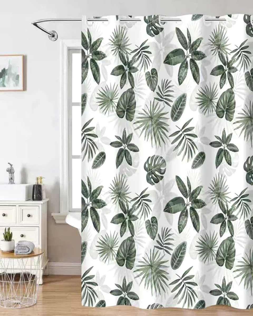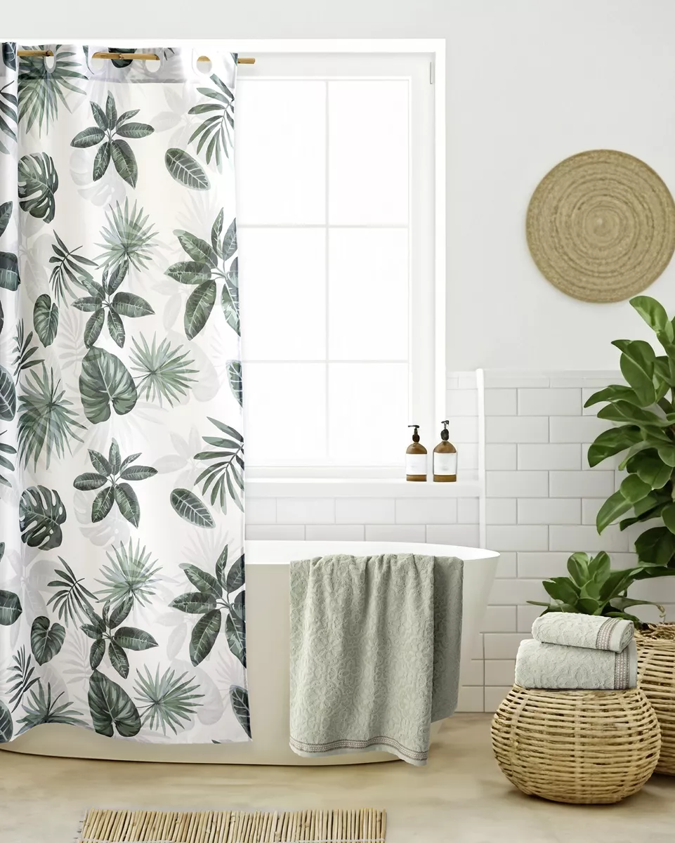 Κουρτίνα μπάνιου από 100% polyester υψηλής ποιότητας, αδιάβροχη και ανθεκτική στη καθημερινή χρήση. πλένεται και στεγνώνει γρήγορα, ενώ τα ενσωματωμένα τρουκς εξασφαλίζουν εύκολη τοποθέτηση. το tropical σχέδιο με εξωτικά φύλλα χαρίζει ζωντάνια και δροσερή αίσθηση στο μπάνιο σας.