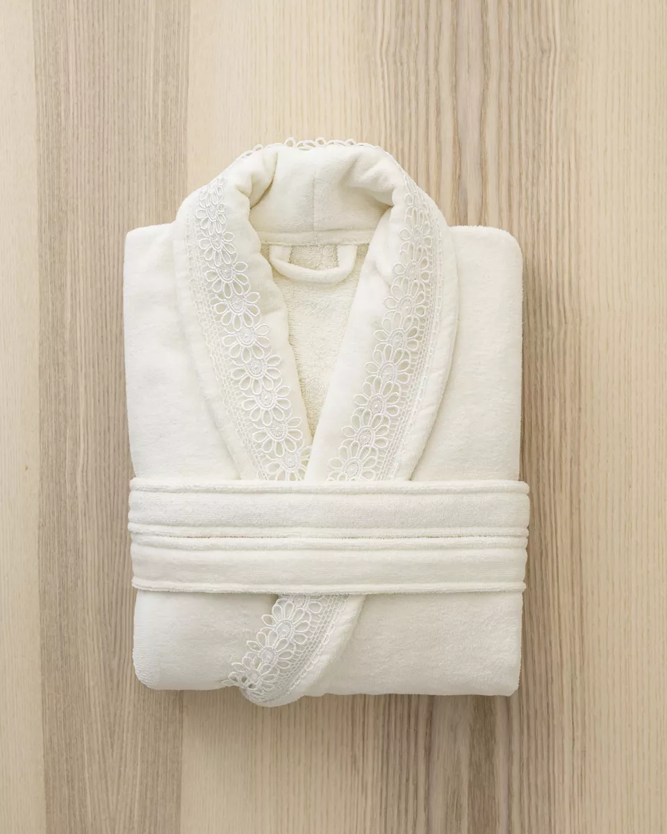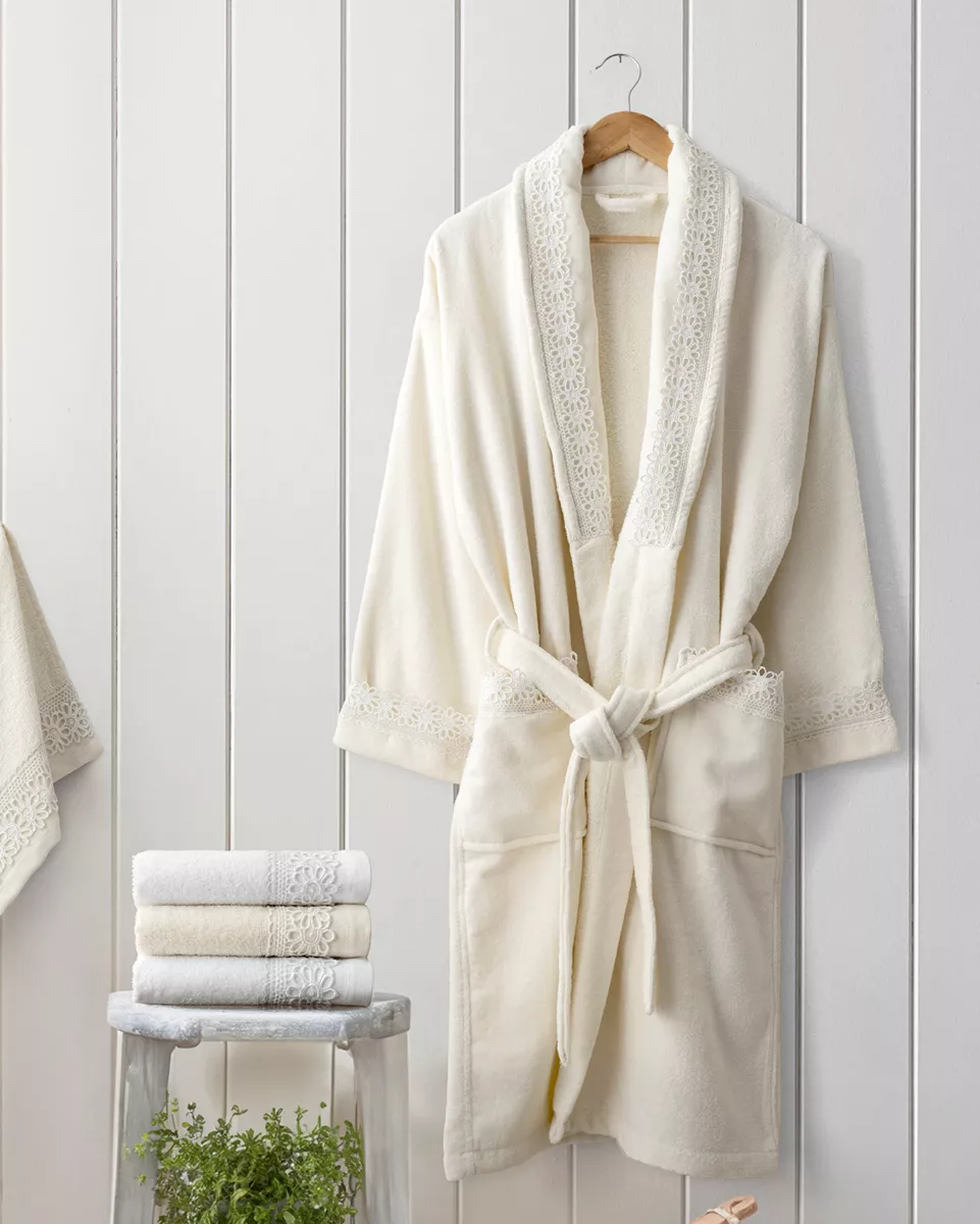 Μπουρνούζι με γιακά δαντέλα από 100% βαμβάκι πενιέ, 380 γρ./μ². απαλό και απορροφητικό, ιδανικό για άνεση και γρήγορο στέγνωμα μετά το μπάνιο. το κομψό σχέδιο με δαντελένιες λεπτομέρειες στον γιακά και τα μανίκια προσθέτει ρομαντική και διαχρονική αισθητική. ανθεκτικό στη χρήση και στις πλύσεις, διατηρεί το σχήμα και την υφή του. ιδανική επιλογή για την νύφη ή για δώρο γάμου.