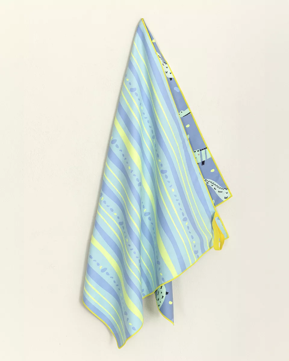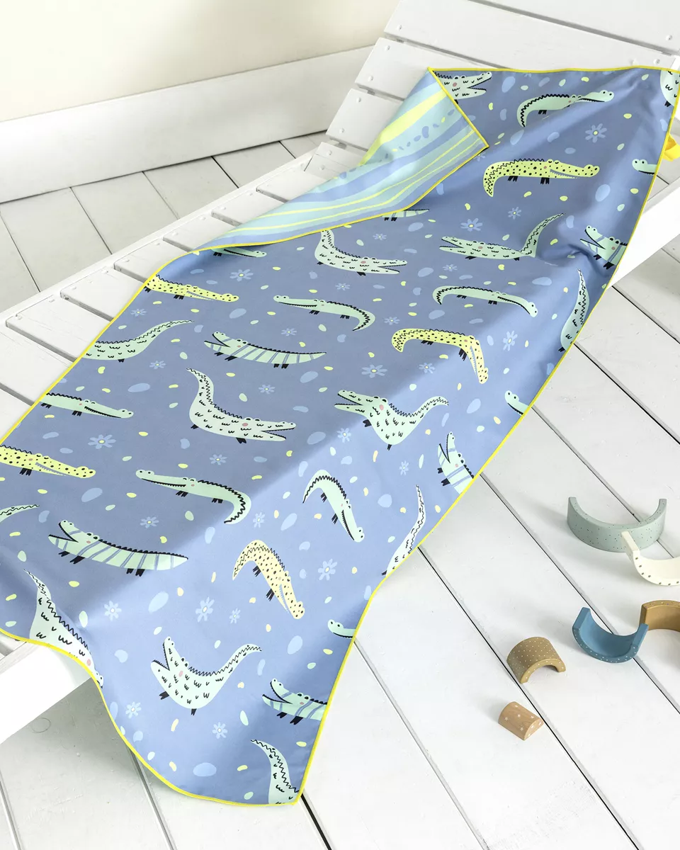 Παιδική πετσέτα θαλάσσης βελουτέ από 100% βαμβάκι 420 γρ./μ², με ύφανση ζακάρ που προσφέρει απαλή υφή, υψηλή απορροφητικότητα και ανθεκτικότητα στη χρήση. ιδανική για την παραλία ή την πισίνα, χαρίζοντας άνεση μετά από κάθε βουτιά. διαθέτει εντυπωσιακό σχέδιο κροκόδειλου ενσωματωμένο στην ύφανση, ενώ τα διακοσμητικά κρόσια στις άκρες προσθέτουν καλοκαιρινό στυλ.