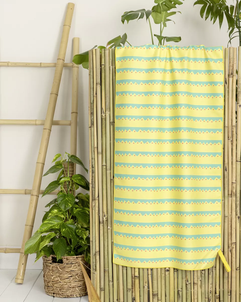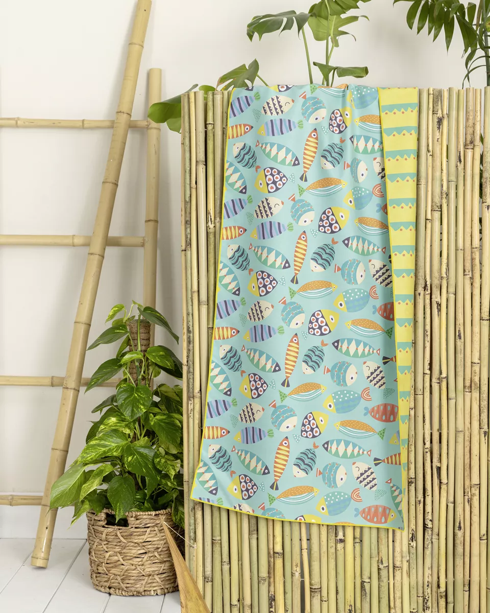 Χαρίστε στα παιδιά δροσιά και παιχνιδιάρικη διάθεση μετά από κάθε βουτιά με την παιδική πετσέτα θαλάσσης από 100% microfiber. εξαιρετικά ελαφριά, με βάρος 200 γρ./μ², απορροφά αποτελεσματικά το νερό και στεγνώνει γρήγορα χάρη στην τεχνολογία quick dry, αποτελώντας ιδανική επιλογή για την παραλία και την πισίνα. η απαλή και ανθεκτική υφή της είναι κατάλληλη για καθημερινή χρήση, ενώ ο διπλής όψης σχεδιασμός και τα χαριτωμένα ψαράκια δημιουργούν ένα δροσερό, θαλασσινό στυλ που ενθουσιάζει τα παιδιά.