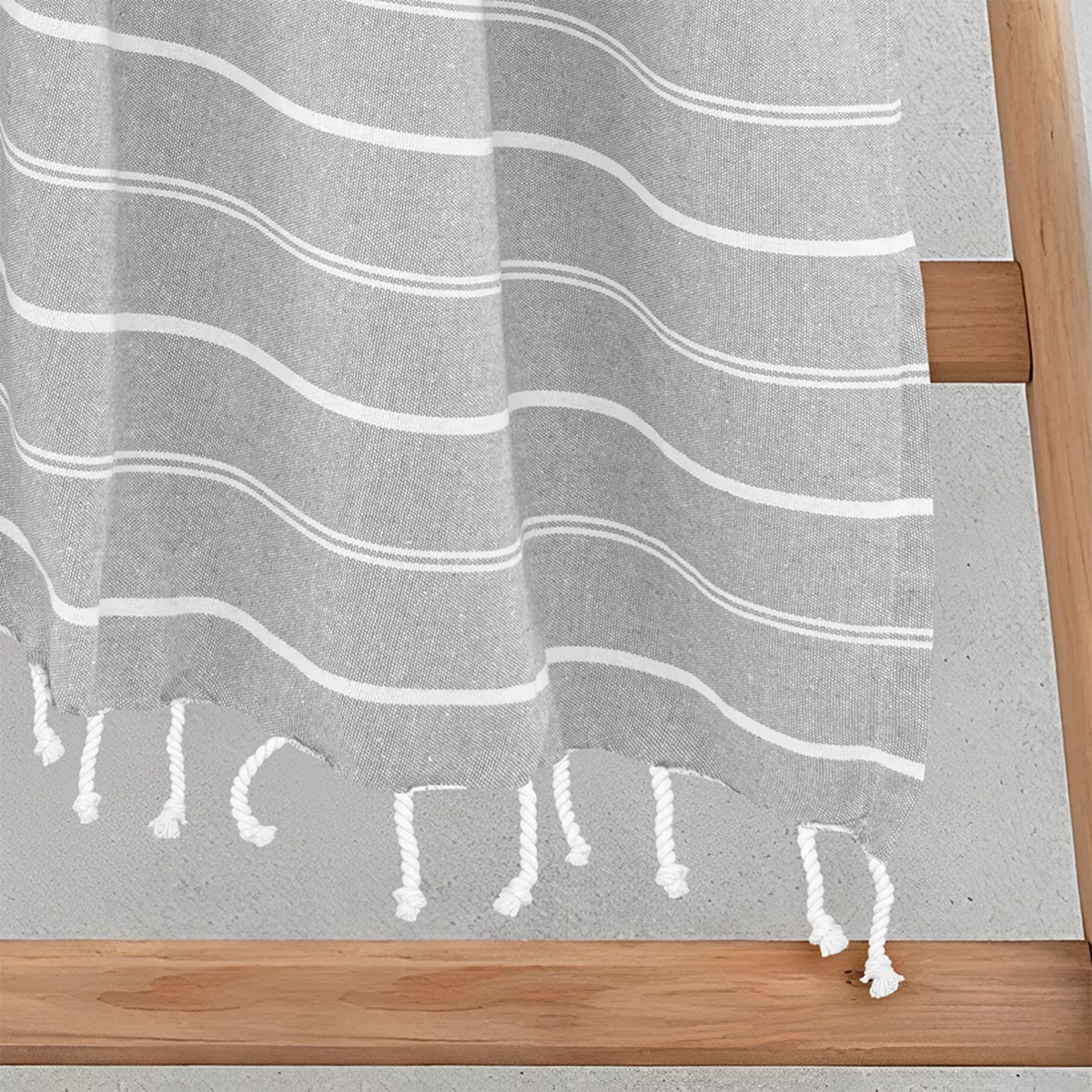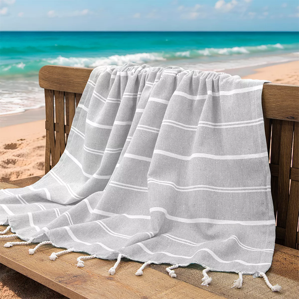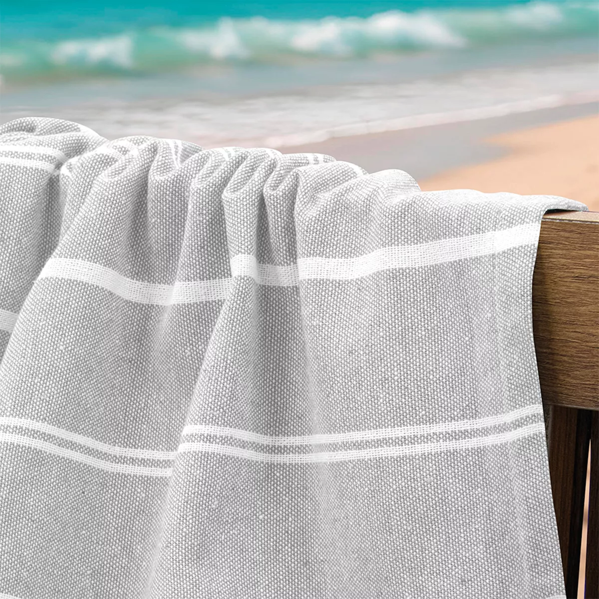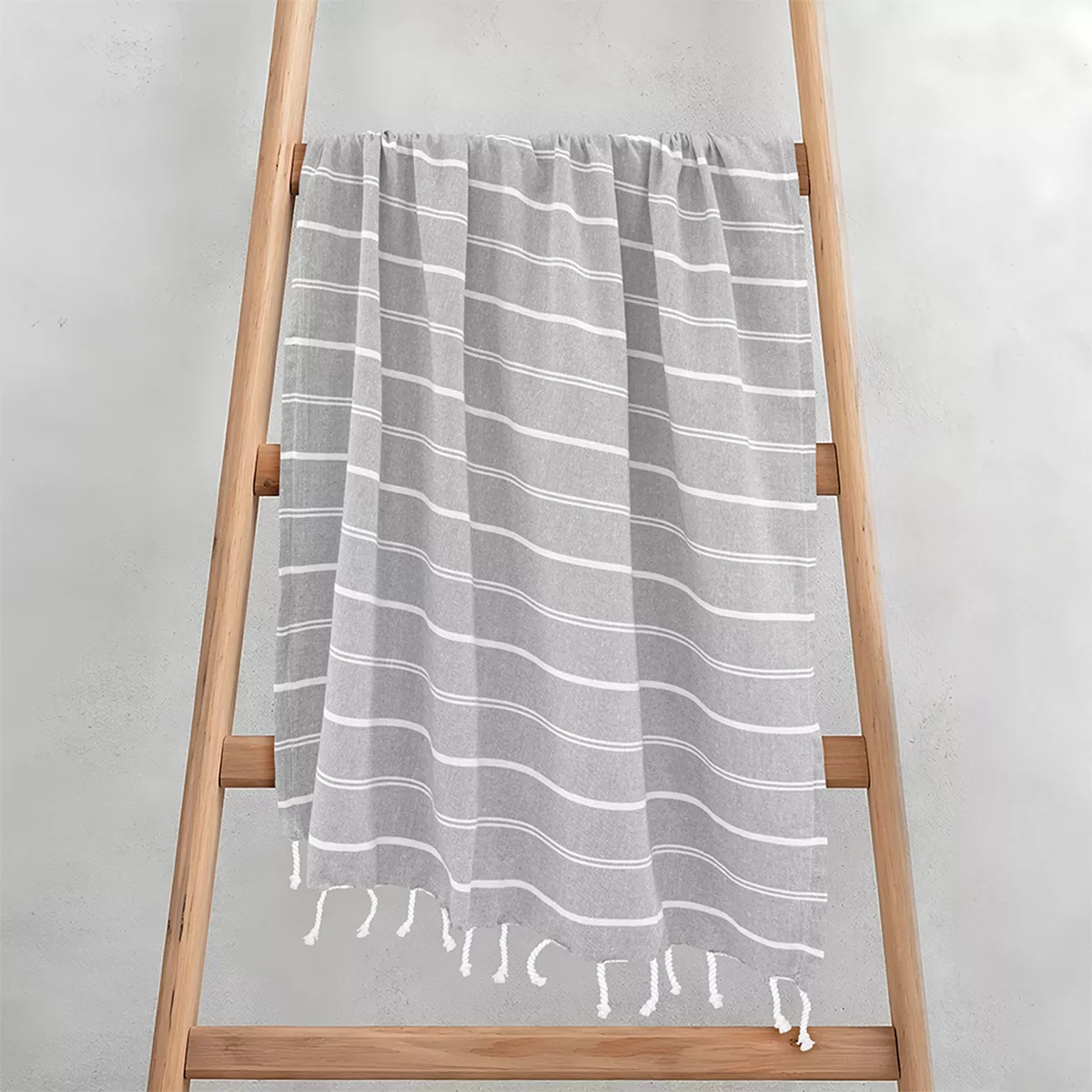 Πετσέτα pestemal σε δροσερή απόχρωση με διακριτικές λευκές ρίγες, που αποπνέει καλοκαιρινή κομψότητα και απλότητα. Το ύφασμά της φαίνεται ελαφρύ και απαλό, ιδανικό για χρήση στην παραλία, την πισίνα ή ακόμα και στο μπάνιο. Οι λευκές λεπτομέρειες και τα μικρά κρόσσια στο τελείωμα προσθέτουν μια παραδοσιακή πινελιά, ενώ ο μίνιμαλ σχεδιασμός την καθιστά εύκολη στον συνδυασμό. Απορροφητική και ταυτόχρονα γρήγορη στο στέγνωμα, αποτελεί πρακτική και κομψή επιλογή για καθημερινή χρήση ή ταξίδια. Προτείνεται πλύσιμο στους 30oC. Προμηθευτής: Lino Home Επωνυμία: Veliu Σύνθεση: 100% Βαμβάκι Χρώμα: Γκρι Διαστάσεις: 90x180 Πιστοποίηση OEKOTEX *Τα χρώματα ενδέχεται να υπόκεινται σε μικρές διαφοροποιήσεις.