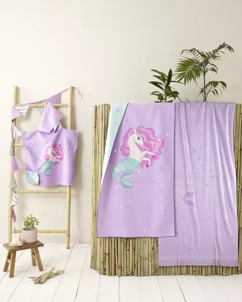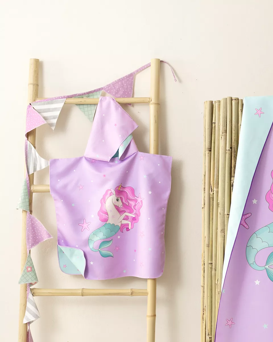 Παιδικό πόντσο θαλάσσης από 100% microfiber 200 γρ./μ², ελαφρύ και απορροφητικό, με τεχνολογία quick dry για γρήγορο στέγνωμα. προσφέρει απαλή αίσθηση στο δέρμα και άνεση μετά το μπάνιο στη θάλασσα ή την πισίνα. ο πρακτικός σχεδιασμός τύπου πόντσο επιτρέπει εύκολη εφαρμογή και ελευθερία κινήσεων, ενώ το παραθυμένιο σχέδιο με τον μονόκερο θα γίνει το αγαπημένο των παιδιών.