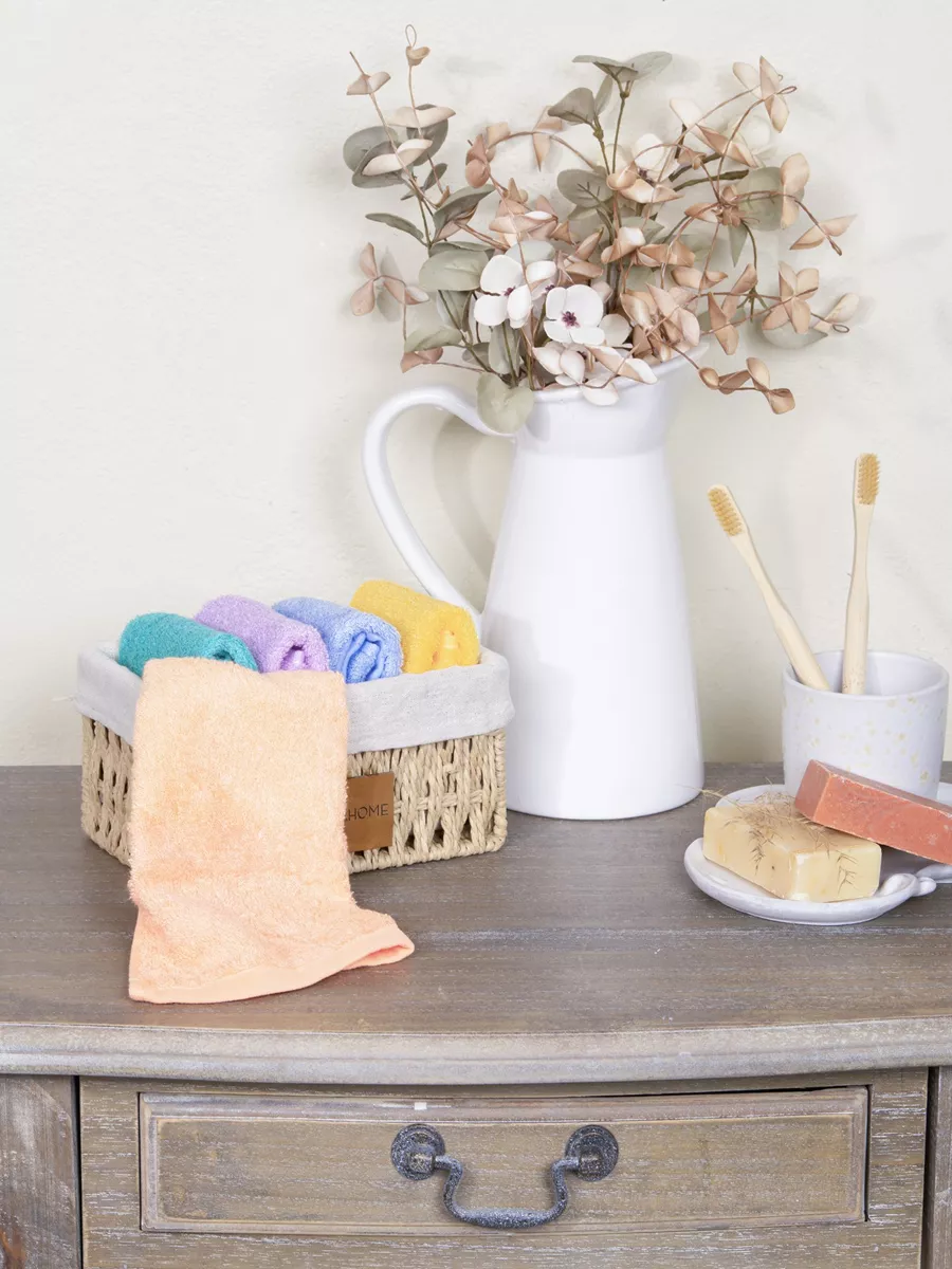 Καλαθάκι με σετ λαβέτες κατασκευασμένα από ίνες bamboo. Το bamboo είναι γνωστό για την εξαιρετική του απαλότητα, που θυμίζει μετάξι, καθώς και για τις φυσικές του αντιμικροβιακές ιδιότητες. Τα πετσετάκια είναι απίστευτα απορροφητικά και στεγνώνουν γρήγορα, κάνοντάς τα ιδανικά για την καθημερινή υγιεινή του προσώπου και των χεριών. Η μοναδική σύνθεση των λαβέτων προσφέρει απαλότητα, απορροφητικότητα και ανθεκτικότητα στο χρόνο, καθιστώντας τις ιδανικές για την καθημερινή χρήση.