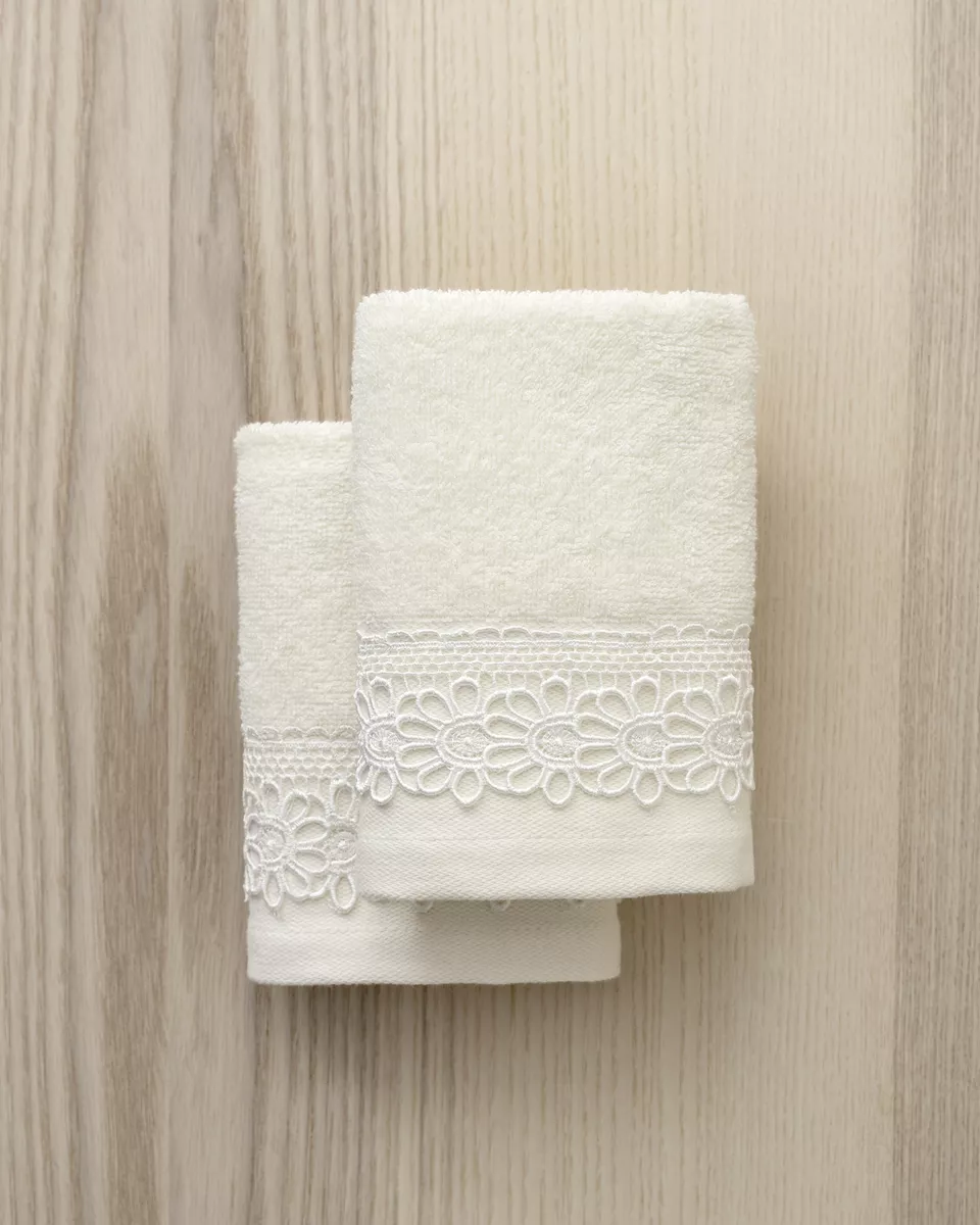 Σετ πετσέτες χεριών με δαντέλα από 100% βαμβάκι πενιέ, 400 γρ./μ². απαλές και απορροφητικές, ιδανικές για καθημερινή χρήση αλλά και για κομψή διακόσμηση μπάνιου. το εκρού χρώμα και η διακοσμητική δαντέλα χαρίζουν διαχρονική αισθητική και ρομαντικό χαρακτήρα. ανθεκτικές στις πλύσεις, διατηρούν το σχήμα και το χρώμα τους. ιδανική επιλογή και για δώρο, σε συσκευασία κουτιού.