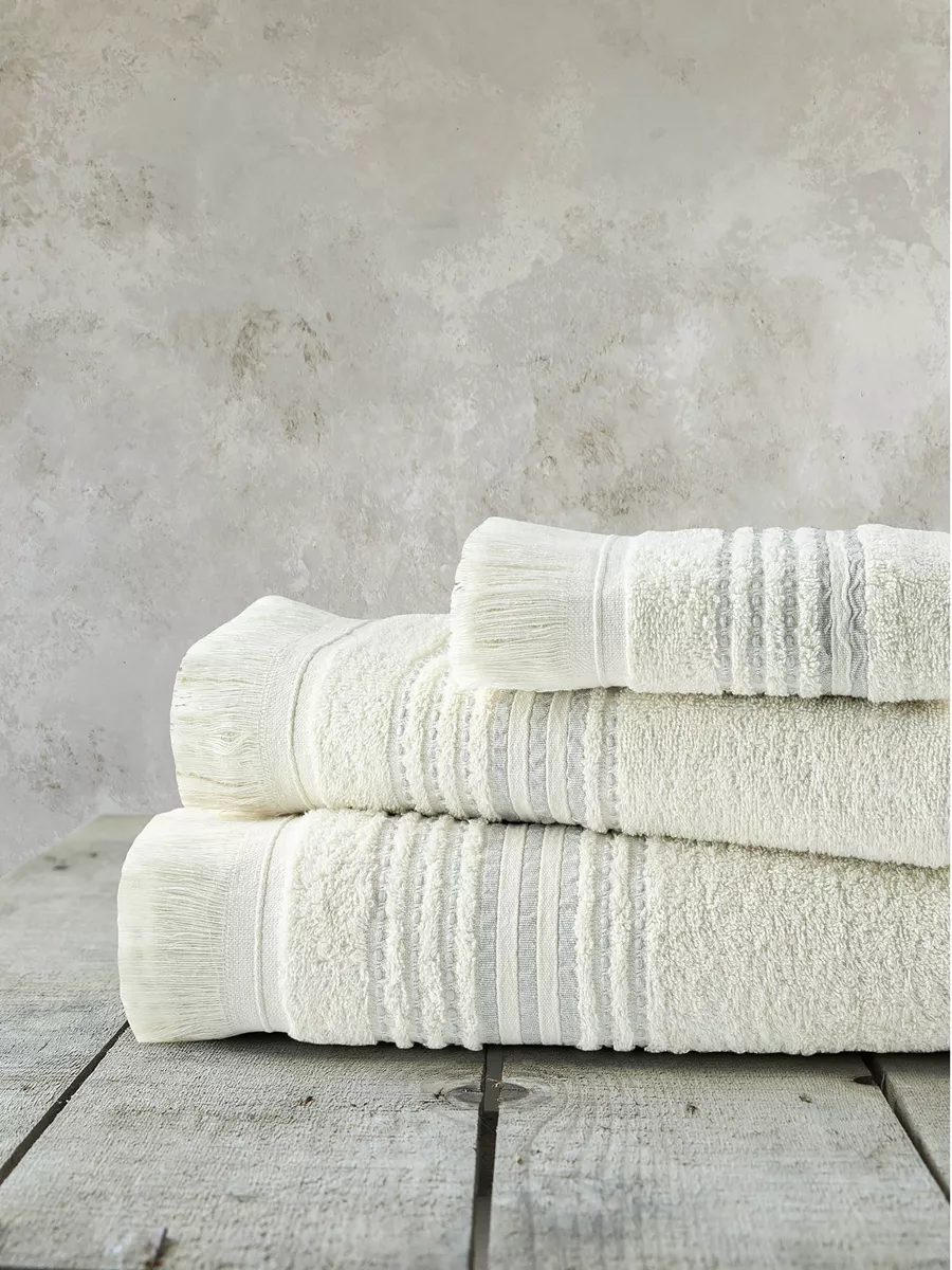 Οι βαμβακερές πετσέτες allora blue έχουν πλούσια υφή και διαχρονικό μπεζ χρώμα.Το τελείωμα της κάθε πετσέτας στολίζεται με γραμμικά σιρίτια σε χρωματική αρμονία με την βάση της, ενώ διακριτικά κρόσσια της δίνουν μια έξτρα κίνηση και εκλεπτυσμένη όψη. Θα ξεχωρίσουν για την λιτή αισθητική και την ποιότητά τους. Προσφέρονται μεμονωμένες και σε σετ τριών τεμαχίων που περιλαμβάνει μία πετσέτα μπάνιου μια προσώπου και μια χεριών. Αναβαθμίστε την εμπειρία του μπάνιου σας με την πετσέτα "allora", η οποία συνδυάζει την απαλότητα με ένα μοντέρνο και διακριτικό σχέδιο. Ιδανική για όσους αναζητούν την κομψότητα στην απλότητα.