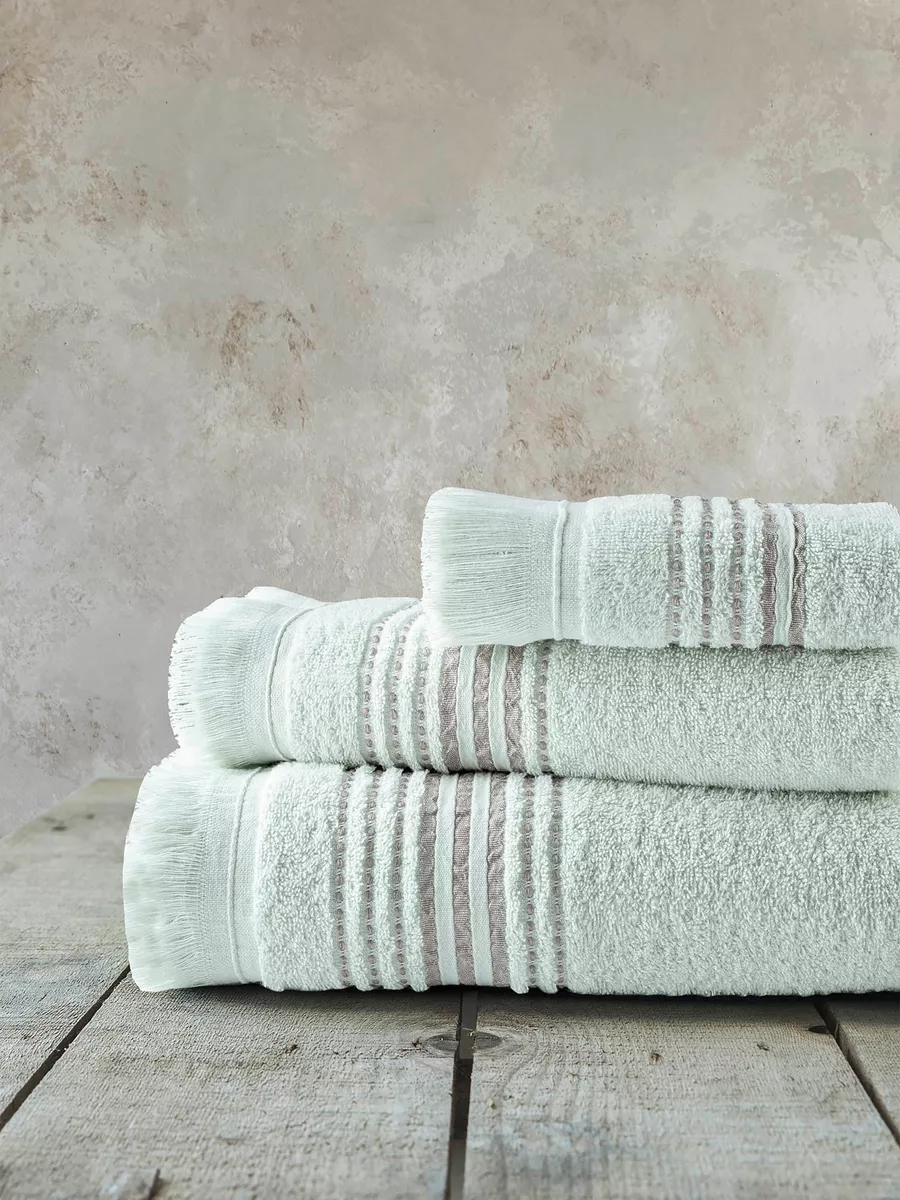 Οι βαμβακερές πετσέτες allora blue έχουν πλούσια υφή και μοντέρνο παστέλ χρώμα της μέντας.Το τελείωμα της κάθε πετσέτας στολίζεται με γραμμικά σιρίτια σε χρωματική αρμονία με την βάση της, ενώ διακριτικά κρόσσια της δίνουν μια έξτρα κίνηση και εκλεπτυσμένη όψη. Θα ξεχωρίσουν για την λιτή αισθητική και την ποιότητά τους. Προσφέρονται μεμονωμένες και σε σετ τριών τεμαχίων που περιλαμβάνει μία πετσέτα μπάνιου μια προσώπου και μια χεριών. Αναβαθμίστε την εμπειρία του μπάνιου σας με την πετσέτα "allora", η οποία συνδυάζει την απαλότητα με ένα μοντέρνο και διακριτικό σχέδιο. Ιδανική για όσους αναζητούν την κομψότητα στην απλότητα.