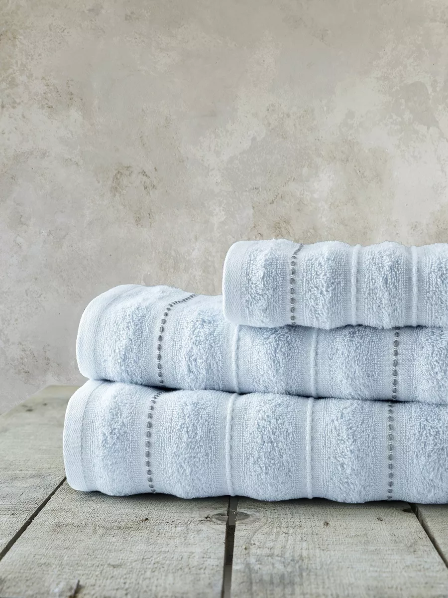 Το βαμβακερό σετ πετσέτες aura light blue έχει παστέλ γαλάζιο χρώμα και αποπνέει ηρεμία και αναζωογόνηση, χαρίζοντας στο μπάνιο σας μια αίσθηση σπα. Το υφαντό jacquard σχέδιό της, με ανάγλυφες ρίγες που διατρέχουν όλη την πετσέτα, δημιουργεί μια κομψή και διαχρονική υφή, ενώ τα τμήματα με πιο πλούσιο και παχύ πέλος προσθέτουν βάθος και ιδιαίτερη απαλότητα στην αφή. Φρεσκάδα, γαλήνη και διακριτική πολυτέλεια συναντιούνται στην πετσέτα aura light blue. Κάθε λεπτομέρειά της είναι σχεδιασμένη ώστε να προσφέρει όχι μόνο πρακτικότητα, αλλά και αισθητική αρμονία.