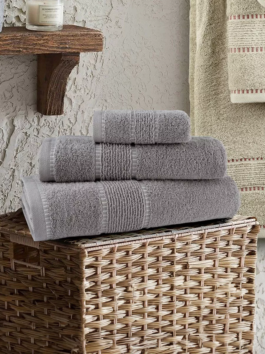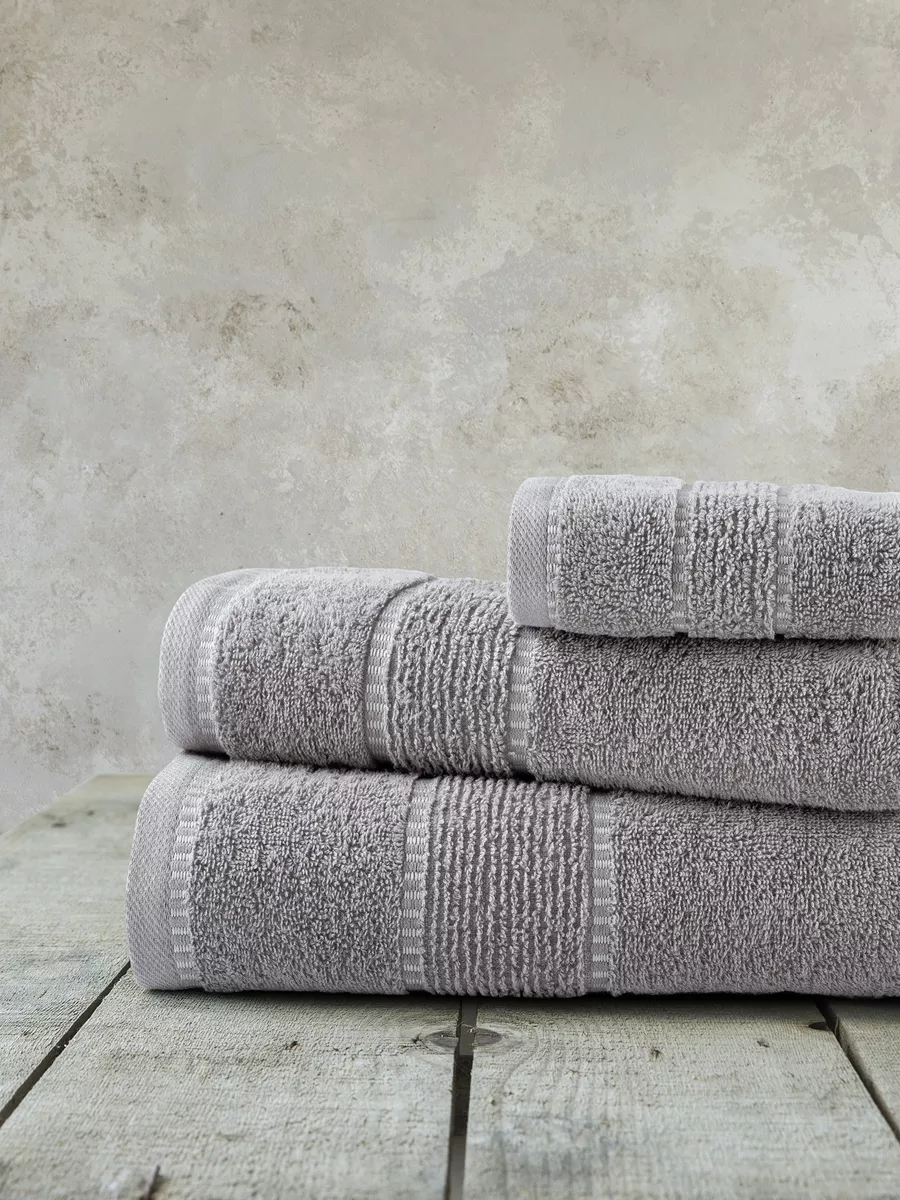 Σετ Πετσέτες 3 τεμαχίων με σύνθεση από 100% βαμβάκι βάρους 450 gsm. Έχει πλούσια, αφράτη υφή και εξαιρετικά απαλή αίσθηση. Χάρη στη βαμβακερή της σύνθεση αναπνέει φυσικά, είναι πολύ απορροφητική, υποαλλεργική και φιλική προς το δέρμα. Προσφέρει άνετο στέγνωμα μετά το ντους ή το μπάνιο. Είναι ιδανική για καθημερινή χρήση και έχει μεγάλη αντοχή στον χρόνο καθώς διατηρεί το σχήμα και το χρώμα της ακόμα και μετά από πολλές πλύσεις, χωρίς να απαιτεί ιδιαίτερη φροντίδα.