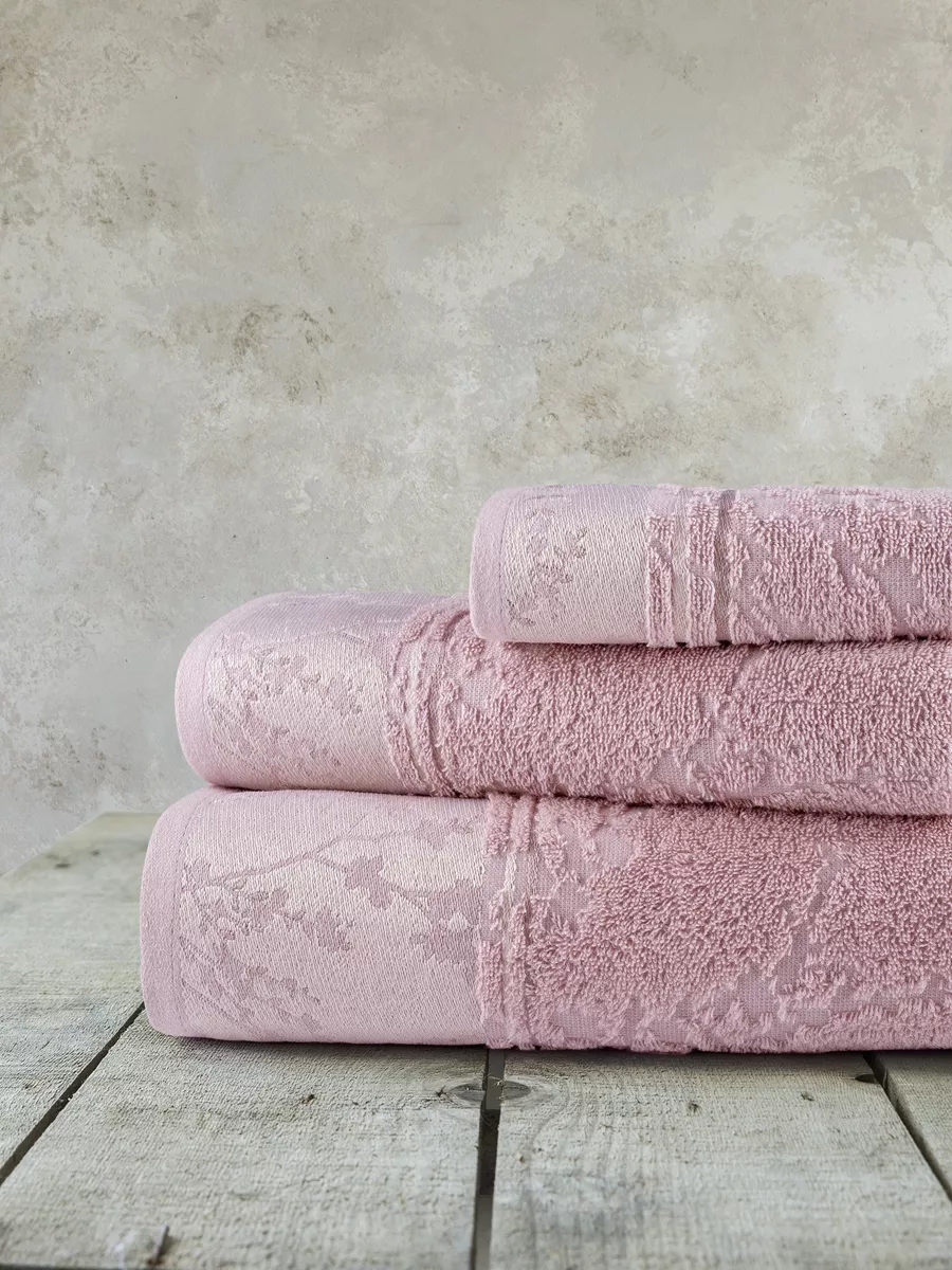 Σετ Πετσέτες jacquard 3 τεμαχίων με σύνθεση από 100% βαμβάκι βάρους 450 gsm. Έχει πλούσια, αφράτη υφή και εξαιρετικά απαλή αίσθηση. Χάρη στη βαμβακερή της σύνθεση αναπνέει φυσικά, είναι πολύ απορροφητική, υποαλλεργική και φιλική προς το δέρμα. Προσφέρει άνετο στέγνωμα μετά το ντους ή το μπάνιο. Είναι ιδανική για καθημερινή χρήση και έχει μεγάλη αντοχή στον χρόνο καθώς διατηρεί το σχήμα και το χρώμα της ακόμα και μετά από πολλές πλύσεις, χωρίς να απαιτεί ιδιαίτερη φροντίδα.