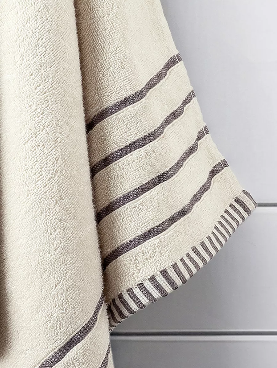 Το βαμβακερό σετ πετσέτες fellow beige έχει σχέδιο κλασικό και μοντέρνο ταυτόχρονα. Ανάγλυφες υφαντές ρίγες που διατρέχουν οριζόντια το κάτω μέρος κάθε πετσέτας, προσδίδουν μια διακριτική υφή και βάθος στην ύφανσή τους. Το μοτίβο είναι αρκετά διακριτικό ώστε να μην κουράζει, αλλά ταυτόχρονα αρκετά εμφανές ώστε να ξεχωρίζει. Το διαχρονικό μπεζ χρώμα τους, παραπέμπει σε ηρεμία και ταιρειάζει εύκολα σε κάθε μπάνιο. Οι ρίγες που διατρέχουν το σχέδιο σε ζεστό καφέ χρώμα, δημιουργούν μια αντίθεση και αναδεικνύουν το minimal σχέδιο της πετσέτας. Η ποιότητα της ύφανσης είναι εμφανής, προσφέροντας μια πλούσια και απαλή αίσθηση που είναι ευχάριστη στο δέρμα. Το σετ πετσέτες "fellow beige" είναι η ιδανική επιλογή για να προσθέσετε έναν αέρα σύγχρονης κομψότητας και χαλάρωσης στον χώρο σας, συνδυάζοντας την άψογη αισθητική με την πρακτική χρησιμότητα.