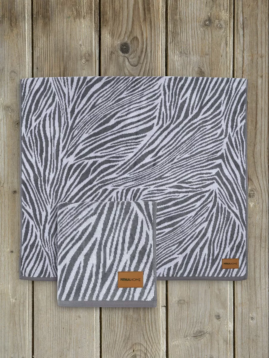 Οι βαμβακερές πετσέτες kiara παρουσιάζονται με σχέδιο που είναι εμπνευσμένο από την φύση. Θα μπορούσε να παραπέμψει σε γραμμές κορμού δέντρου ή ακόμα στις γραμμές που έχει το δέρμα της ζέβρας, προσδίδοντας έναν δυναμικό χαρακτήρα στον χώρο σας. Το αρχοντικό αλλά και δυναμικό ταυτόχρονα γκρι χρώμα τους, έρχεται να συμπληρώσει μια αρμονική και μοντέρνα αισθητική που θα δώσει έναν αέρα φρεσκάδας στο μπάνιο σας. Η ζακάρ βελουτέ ύφανση προσδίδει μια απαλή, βελούδινη αίσθηση στο άγγιγμα, ολοκληρώνοντας την πολυτελή εμπειρία. Αναβαθμίστε το μπάνιο σας με την πετσέτα "kiara" της nima home, σχεδιασμένη για να προσφέρει έναν συνδυασμό τολμηρού στυλ και ασύγκριτης πολυτέλειας. Είναι η επιλογή που αποπνέει αυτοπεποίθηση και φινέτσα, μεταμορφώνοντας την καθημερινή σας ρουτίνα.