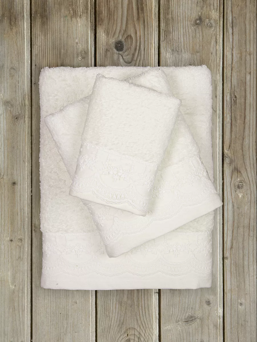 Σετ Πετσέτες με δαντέλα με σύνθεση από 100% βαμβάκι πενιέ, βάρους 450 gsm. Έχουν πλούσια, αφράτη υφή και εξαιρετικά απαλή αίσθηση. Χάρη στη βαμβακερή τους σύνθεση αναπνέουν φυσικά, είναι πολύ απορροφητικές, υποαλλεργικές και φιλικές προς το δέρμα. Προσφέρουν άνετο στέγνωμα μετά το ντους ή το μπάνιο. Είναι ιδανικές για να στολίσετε το μπάνιο σας αλλά και για χρήση καθώς έχουν μεγάλη αντοχή στον χρόνο καθώς διατηρούν το σχήμα και το χρώμα τους μακροχρόνια, χωρίς να απαιτούν ιδιαίτερη φροντίδα.
