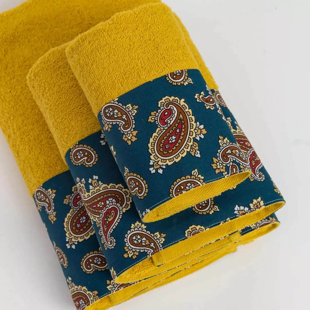 Σετ πετσέτες 3 τεμαχίων, μπάνιου, προσώπου και χειρός, από ύφασμα φροτέ, πενιέ, 100% βαμβακερό, με διακοσμητική φάσα ύφασμα. Διατίθεται σε 3 χρώματα.