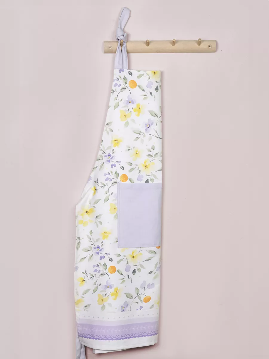 Η ποδιά brunch time ξεχωρίζει για το πλούσιο digital print σχέδιό της, που αποτυπώνει με εντυπωσιακή ακρίβεια κάθε λεπτομέρεια. Το μοτίβο είναι ένα όμορφο μείγμα από κίτρινα και μωβ λουλούδια, διάσπαρτα με μικρά πορτοκαλί φρούτα και πράσινα φύλλα, δημιουργώντας μια ατμόσφαιρα ανθισμένου κήπου. Το σχέδιο ολοκληρώνεται με μια κομψή, ριγέ μπορντούρα σε παστέλ λιλά τόνο, ενώ διαθέτει και μια πρακτική τσέπη για να έχετε πάντα τα απαραίτητα κοντά σας. Φέρτε την αισιοδοξία και την έμπνευση στην κουζίνα σας με την ποδιά "brunch time". Σχεδιασμένη για να σας προστατεύει με στυλ, είναι το ιδανικό αξεσουάρ για να απολαύσετε κάθε στιγμή της δημιουργίας, από το ψήσιμο μέχρι το μαγείρεμα.
