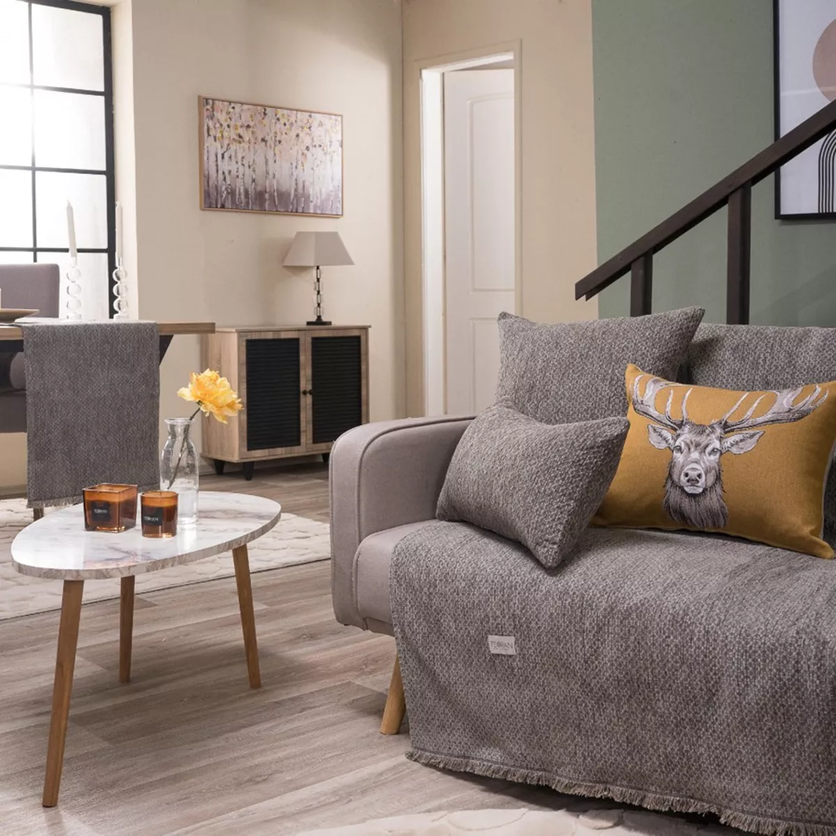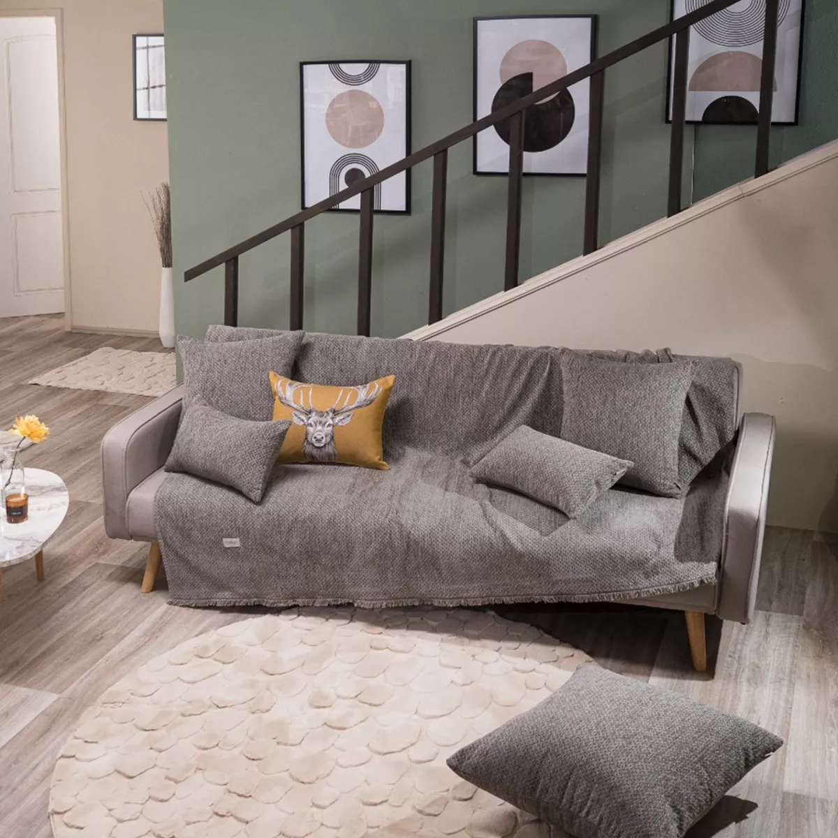 Τα υφάσματα υφαίνονται στην Ελλάδα από ελληνική υφαντουργία και μεταποιούνται από την εταιρία μας.Η σύνθεση του υφάσματος των ριχταριών αποτελείται από νήματα ακρυλικά σε ποσοστό 48%,βαμβακερά σε ποσοστό 30% και πολυεστερικά σε ποσοστό 22%.
