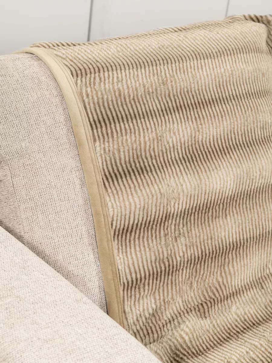 Αντιολισθητικό ριχτάρι καναπέ με σύνθεση από εξαιρετικά απαλό rabbit fur 480 gr, που χαρίζει μοναδική αίσθηση πολυτέλειας και απαλότητας.Το χαρακτηριστικό του πολυεστερικού υφάσματός του είναι η αντοχή, μιας και μπορεί να διατηρήσει αναλλοίωτο το σχήμα και το χρώμα του για πάρα πολλά χρόνια και μετά από πολλές πλύσεις. Η πίσω του πλευρά από σουέτ προσφέρει μια φυσική αντιολισθητική επιφάνεια, που θα κρατήσει το ριχτάρι σταθερό στον καναπέ σας. h εξαιρετική ποιότητα των υλικών του εγγυάται άνεση και μακροχρόνια ανθεκτικότητα.Το αντιολισθητικό ριχτάρι καναπέ lunetta beige συνδυάζει μοναδική κομψότητα με πρακτικότητα. Η μπροστινή πλευρά του, από εξαιρετικά απαλό rabbit fur 480 gr, διαθέτει ανάγλυφη ριγέ υφή με διακριτικό κυματιστό μοτίβο, που δημιουργεί μια αίσθηση κίνησης και ζεστασιάς στον χώρο. Το μοναδικό παιχνίδι φωτός και σκιάς πάνω στην επιφάνειά του κάνει το ριχτάρι ακόμα πιο εντυπωσιακό, χαρίζοντας βάθος και στυλ στη διακόσμηση. Η πίσω πλευρά, από αντιολισθητικό suede 180 gr, εξασφαλίζει τέλεια σταθερότητα ώστε να μένει πάντα στη θέση του, ενώ το διαχρονικό μπεζ χρώμα του ταιριάζει ιδανικά σε κάθε σαλόνι, από minimal μέχρι πιο κλασικό. Ιδανικό για cozy απογεύματα, αλλά και για να ανανεώσεις τον καναπέ σου εύκολα και γρήγορα.