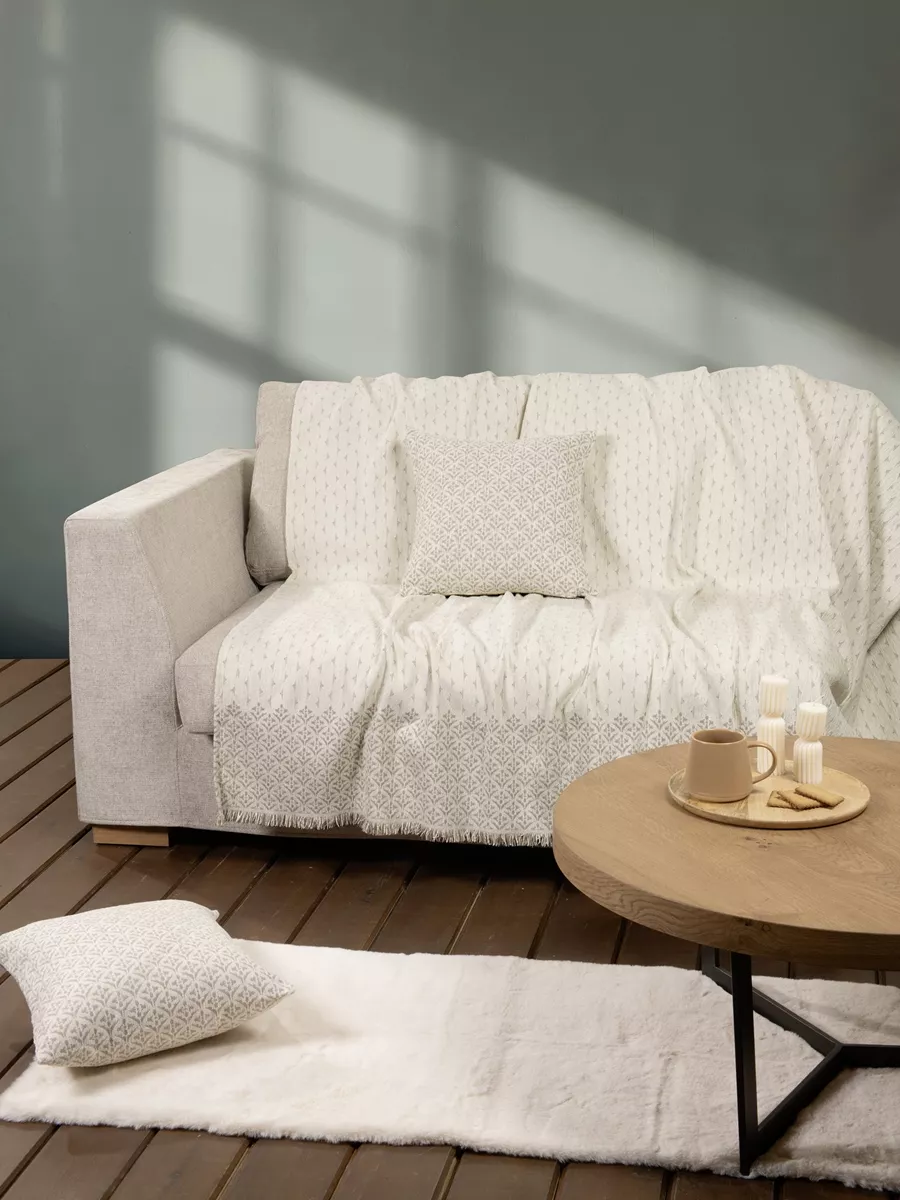 to ριχτάρι roselle ivory έχει ένα όμορφο και διακριτικό σχέδιο σε εκρού χρώμα, που συνδυάζεται εύκολα και δίνει μια αίσθηση ηρεμίας και χαλάρωσης. Έχει minimal γεωμετρικό μοτίβο στο μεγαλύτερο μέρος της επιφάνειάς του, ενώ το τελείωμά του διακοσμεί μια όμορφη φάσα με πυκνό γεωμετρικό μοτίβο. Οι λεπτομέρειες με τα κρόσσια στις άκρες του ριχταριού προσδίδουν μια επιπλέον πινελιά κομψότητας και ανεπιτήδευτης γοητείας. Το ριχτάρι αυτό δεν είναι μόνο πρακτικό για την προστασία των επίπλων σας, αλλά και ένα κομμάτι που θα αναβαθμίσει την αισθητική του χώρου σας. Συνδυάστε το με τα ασορτί διακοσμητικά μαξιλάρια για ένα ολοκληρωμένο και εντυπωσιακό αποτέλεσμα.