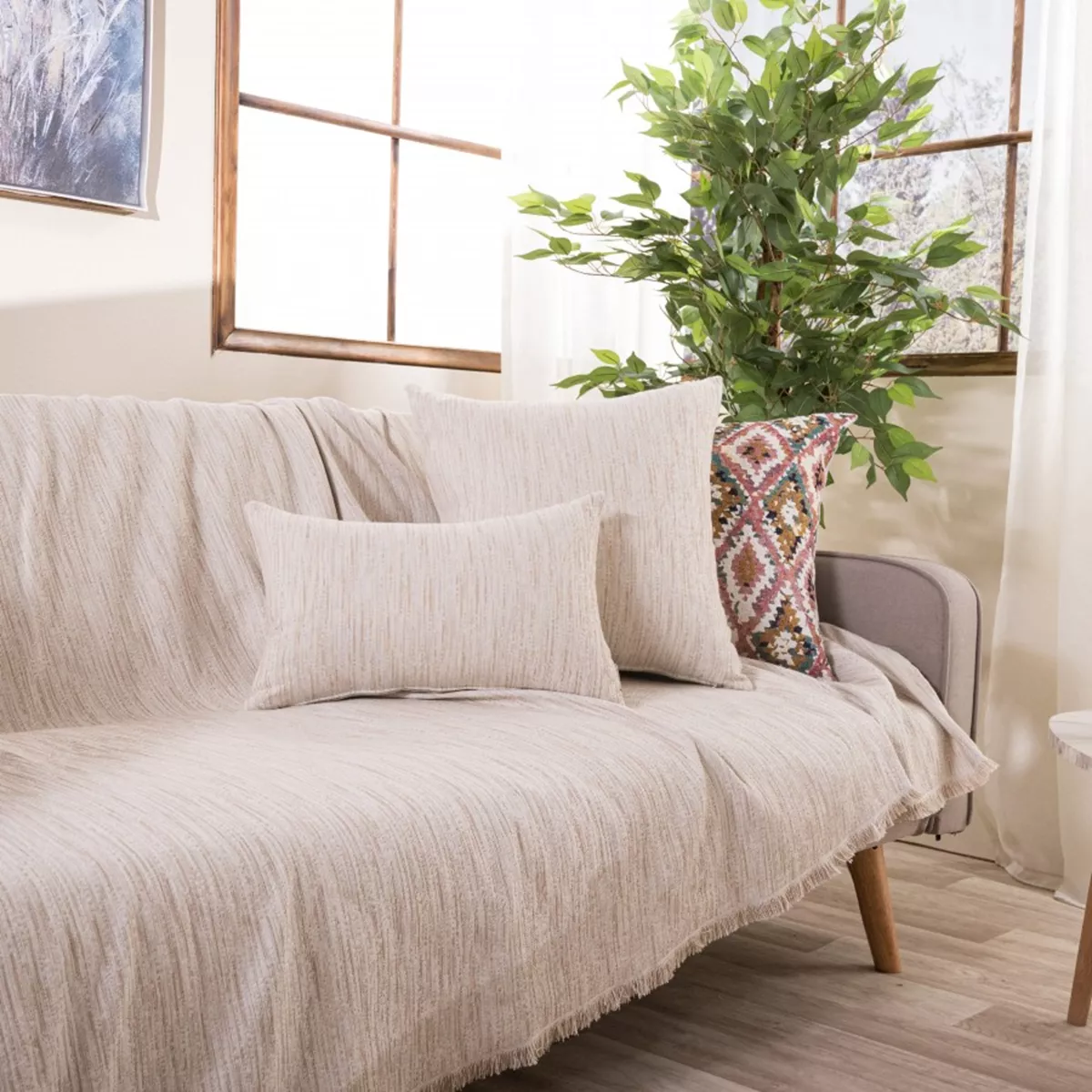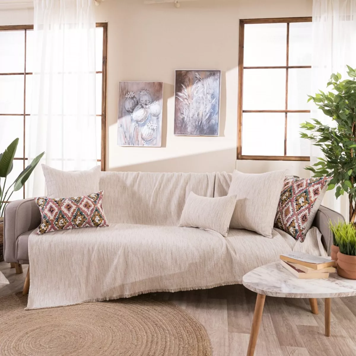 Τα υφάσματα υφαίνονται στην Ελλάδα από ελληνική υφαντουργία και μεταποιούνται από την εταιρία μας.Η σύνθεση του υφάσματος των ριχταριών αποτελείται από νήματα βαμβακερά σε ποσοστό 75% και πολυεστερικά σε ποσοστό 25%.