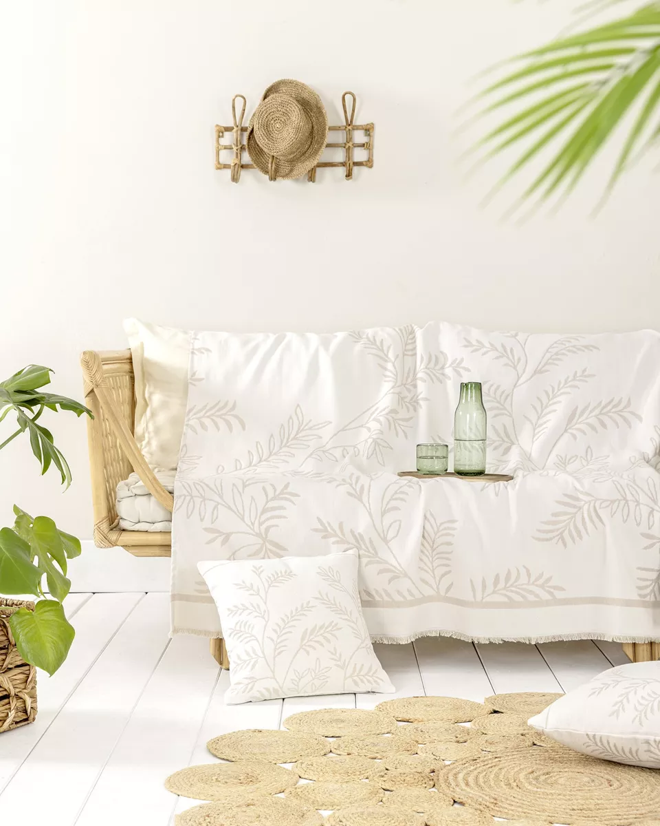 Ριχτάρι καναπέ – πολυθρόνας από 80% βαμβακερό ζακάρ ύφασμα και 20% polyester, που συνδυάζει απαλότητα, δροσερή αίσθηση και ανθεκτικότητα. ελαφρύ και εύπλαστο, εφαρμόζει εύκολα χωρίς να ζαρώνει, ενώ διατηρεί το χρώμα και το σχήμα του στο χρόνο. το διακριτικό σχέδιο σε συνδυασμό με τα κομψά κρόσσια, χαρίζει φυσική και μοντέρνα αισθητική, ιδανική για τους ανοιξιάτικους και καλοκαιρινούς μήνες. πλένεται στο πλυντήριο και διατίθεται σε διαστάσεις που καλύπτουν κάθε τύπο καναπέ.