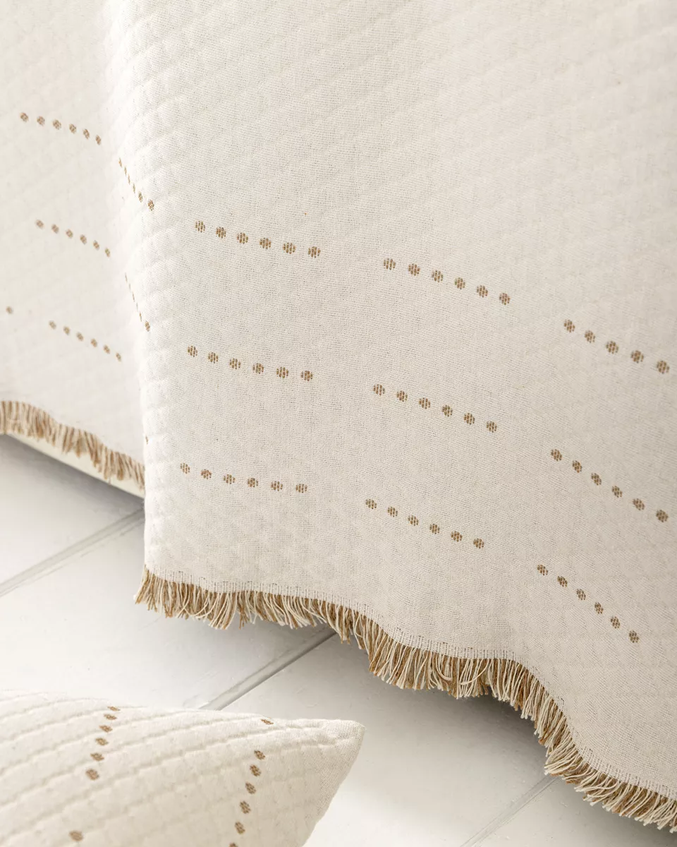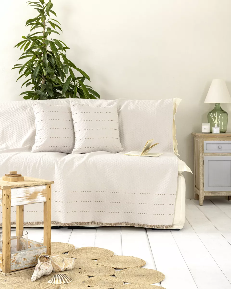 Ριχτάρι καναπέ – πολυθρόνας από 80% βαμβακερό ζακάρ ύφασμα και 20% polyester, που συνδυάζει απαλότητα, δροσερή αίσθηση και ανθεκτικότητα. ελαφρύ και εύπλαστο, εφαρμόζει εύκολα χωρίς να ζαρώνει, ενώ διατηρεί το χρώμα και το σχήμα του. η ανάγλυφη υφή προσθέτει βάθος και κομψότητα στον χώρο, ενώ τα διακριτικά κρόσσια στο τελείωμα χαρίζουν μια χαλαρή και στιλάτη πινελιά. ιδανικό για να ανανεώσετε το σαλόνι σας με εύκολο και κομψό τρόπο.
