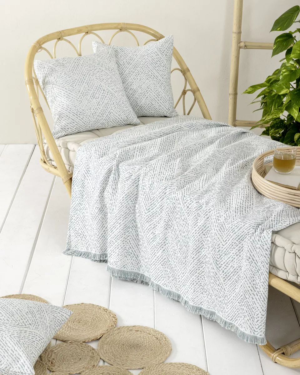 Ριχτάρι καναπέ – πολυθρόνας από 80% βαμβακερό ζακάρ ύφασμα και 20% polyester, που συνδυάζει απαλότητα, δροσερή αίσθηση και ανθεκτικότητα. ελαφρύ και εύπλαστο, εφαρμόζει εύκολα χωρίς να ζαρώνει, ενώ διατηρεί το χρώμα και το σχήμα του στο χρόνο. το διακριτικό σχέδιο σε συνδυασμό με τα κομψά κρόσσια, χαρίζει φυσική και μοντέρνα αισθητική, ιδανική για τους ανοιξιάτικους και καλοκαιρινούς μήνες. πλένεται στο πλυντήριο και διατίθεται σε διαστάσεις που καλύπτουν κάθε τύπο καναπέ.