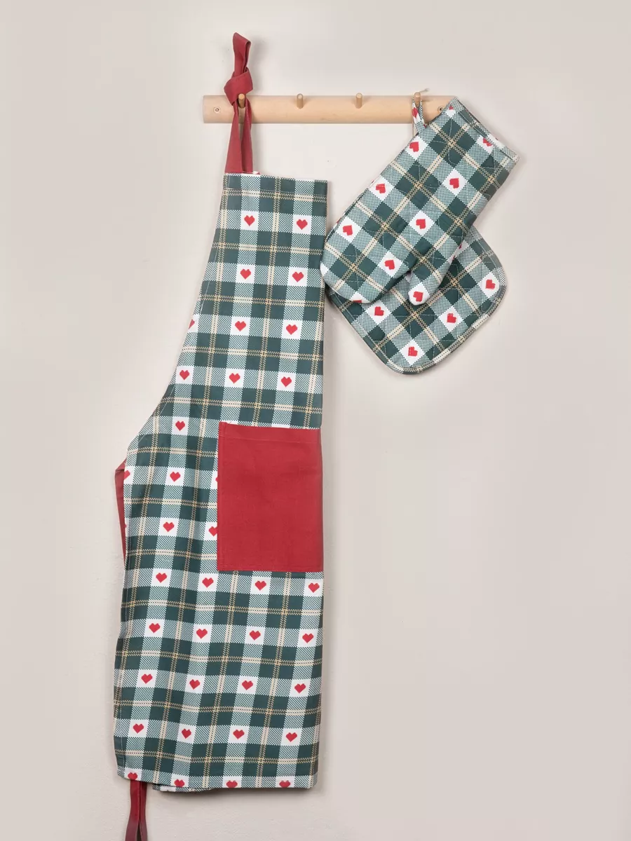 Η Χριστουγεννιάτικη ποδιά christmas love ξεχωρίζει για τον κλασικό της σχεδιασμό με πράσινο καρό που εμπλουτίζεται με μικρές κόκκινες καρδιές που προσθέτουν μια γλυκιά και παιχνιδιάρικη πινελιά. Οι κατακόκκινες προσθήκες της τσέπης και των κορδονιών της ποδιάς δίνουν μια φωτεινή πινελιά χαράς. Είναι ιδανική για να σας προστατεύσει "κομψά" τις γιορτινές μέρες του χρόνου. Συνδυάστε τη με ασορτί τραπεζομάντηλο, γάντι και πιάστρα κουζίνας για ένα ολοκληρωμένο look.
